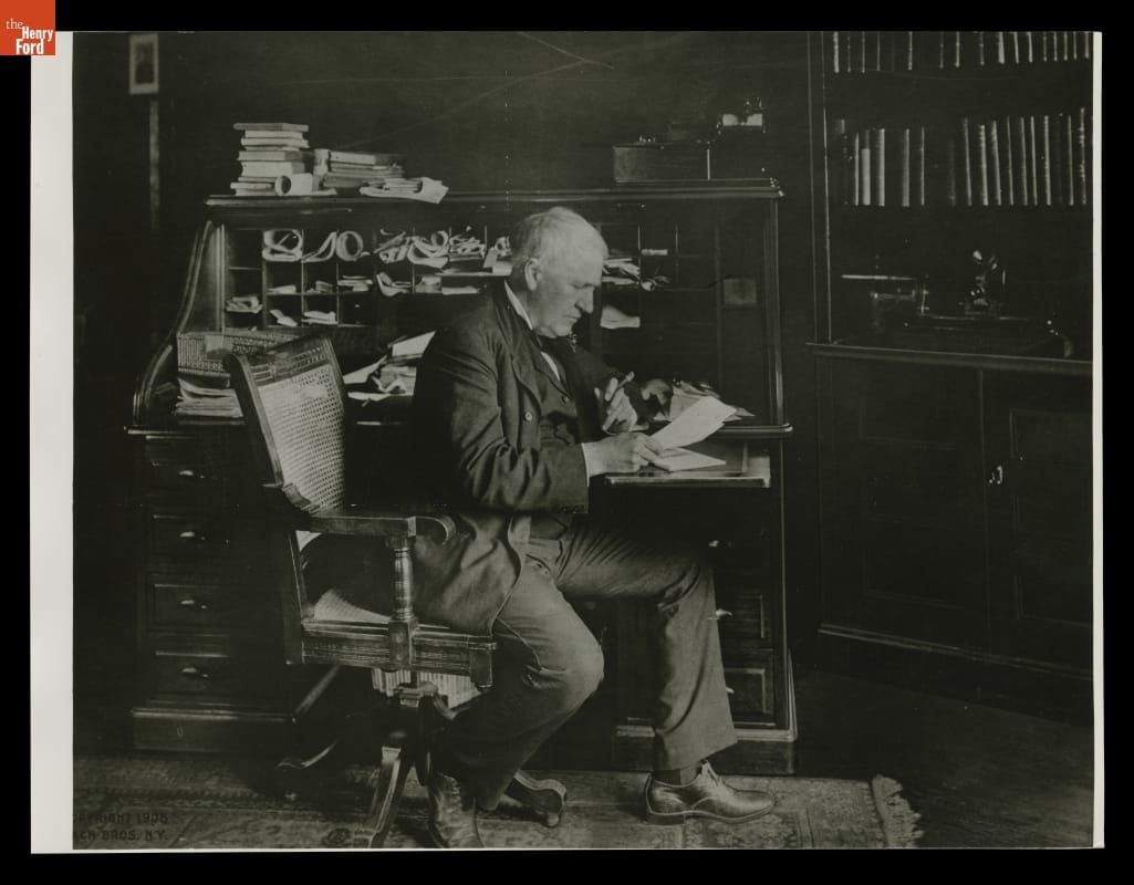 This photograph shows prolific inventor and American entrepreneur Thomas Edison around age 60. By this time, Edison had invented and built entire industries around the phonograph, the incandescent electric lamp, and the Kinetoscope. Though he continued important work at his vast West Orange, New Jersey, laboratory and elsewhere, Edison was beginning to oversee fewer of his companies' daily operations.