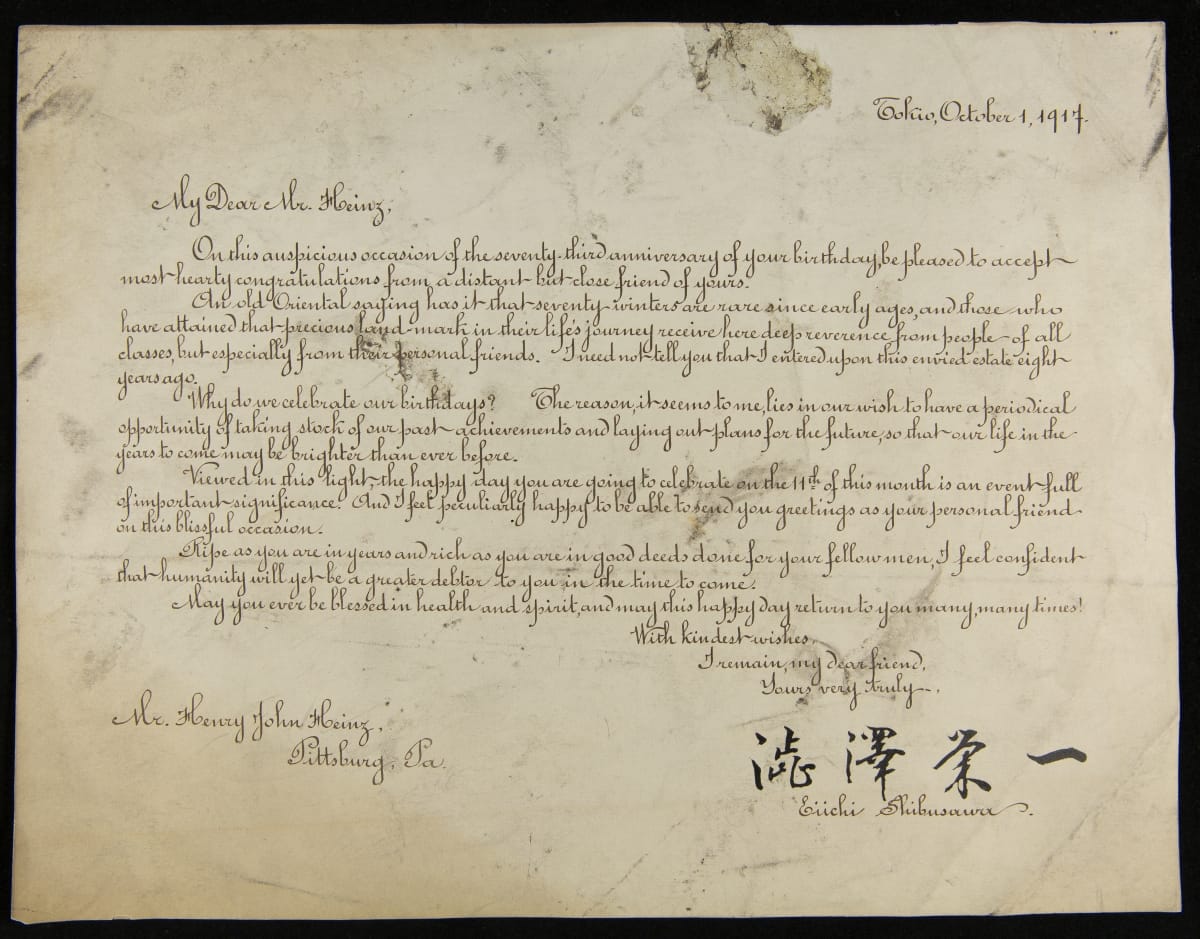letter reads: Tokiyo, October 1, 1917. / My Dear Mr. Heinz, / On this auspicious occasion of the seventy-third anniversary of your birthday, be pleased to accept most / hearty congratulations from a distant but close friend of yours. / An old Oriental saying has it that seventy winters are rare since early ages, and those who have attained that precious landmark in their life's journey receive here deep reverence from people of all / classes, but especially from their personal friends. I need not tell you that I entered upon this envied state eight / years ago. / Why do we celebrate our birthdays? The reason, it seems to me, lies in our wish to have a periodical / opportunity of taking stock of our posh achievements and laying our plous for the future, so that our life in the / years to come may be brighter than ever before. / Viewed in this light, the happy day you are going to celebrate on the 11th of this month is an event full / of important significance. And I feel peculiarly happy to be able to send you greetings as your personal friend / on this blissful occasion. / Ripe as you are in years and rich as you are in good deeds done for your fellow men, I feel confident / that humanity will yet be a greater debtor to you in the time to come. / May you ever be blessed in health and spirit, and may this happy day return to you many, many times! / With kindest wishes, / I remain, my dear friend, / Yours very truly, / [signature in Japanese] Eiichi Shibusawa. / Mr. Henry John Heinz, / Pittsburg, Pa.