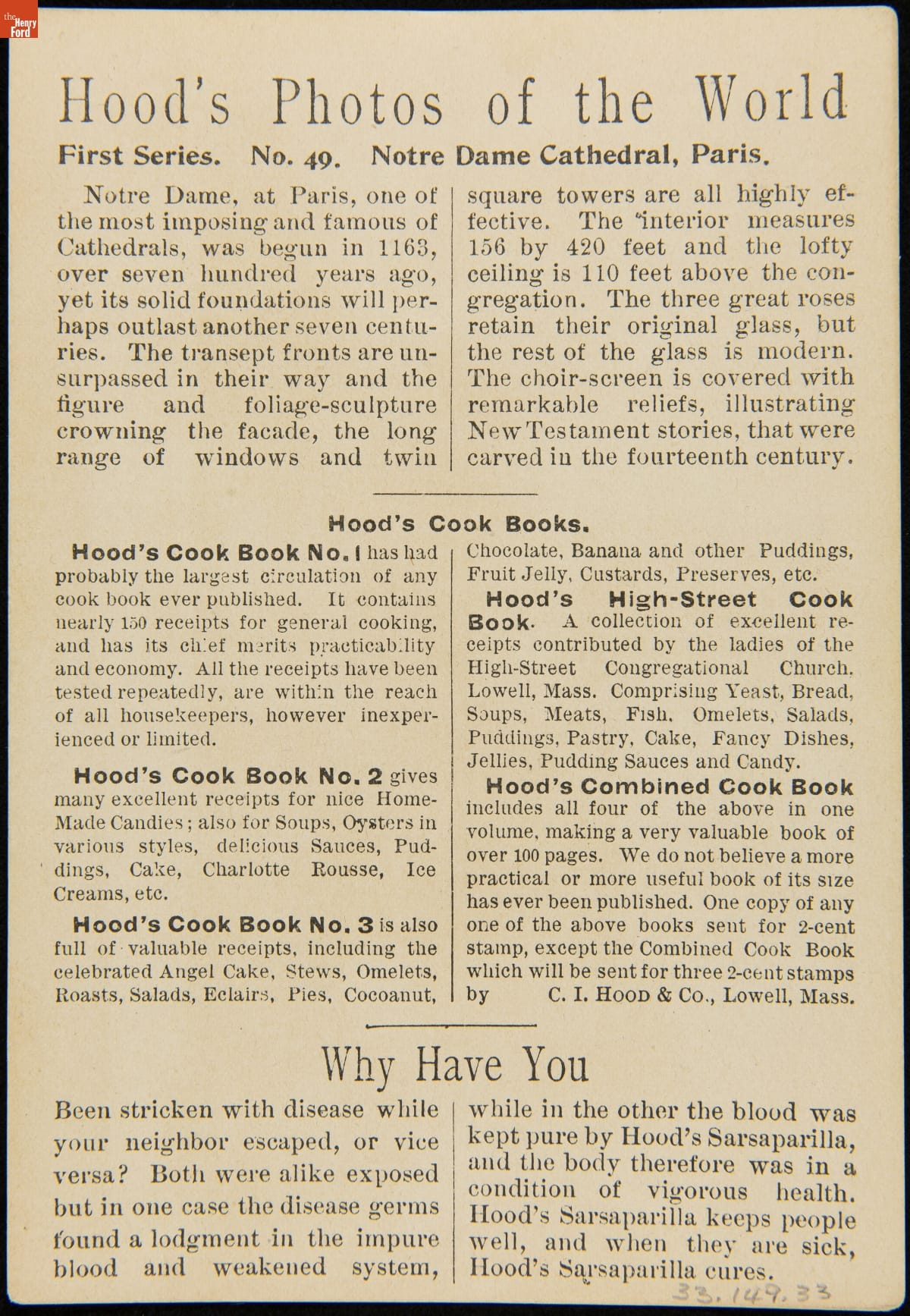 Trade Card for C.I. Hood & Co. with Hood's Photos of the World, "Notre Dame Cathedral, Paris," 1890-1910