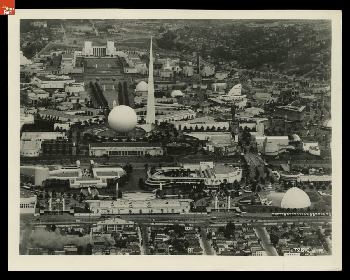 This November 2, 1939 Ford Motor Company photograph shows an aerial view of the New York World's Fair. The Ford Motor Company building appears in the second row of buildings, with its signature circular, tiered "road of tomorrow" flanking its left side. The central Trylon and Perisphere dominate the scene.