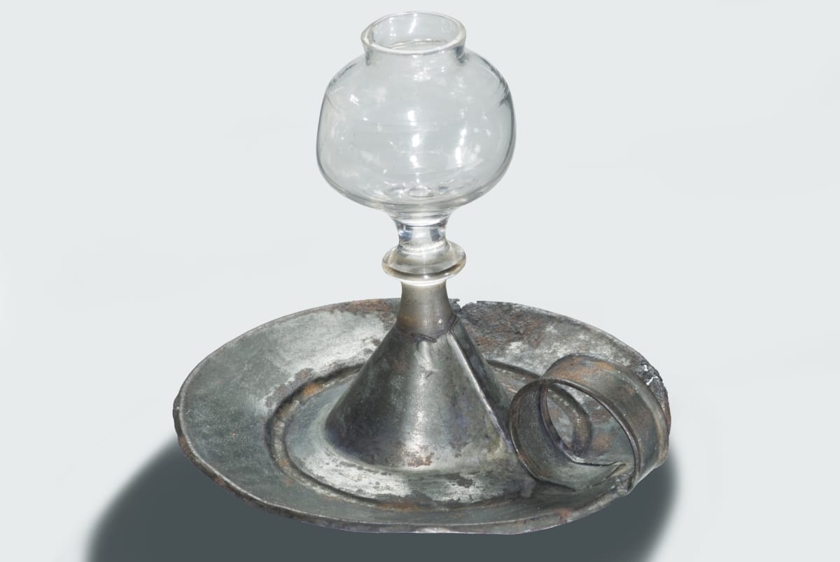 Traditional make-dos are useful and precious objects that broke during their working lives. Their owners felt compelled to restore or repurpose these objects in a variety of ways. The glass base of this lamp broke and it was given a new base made of tin.