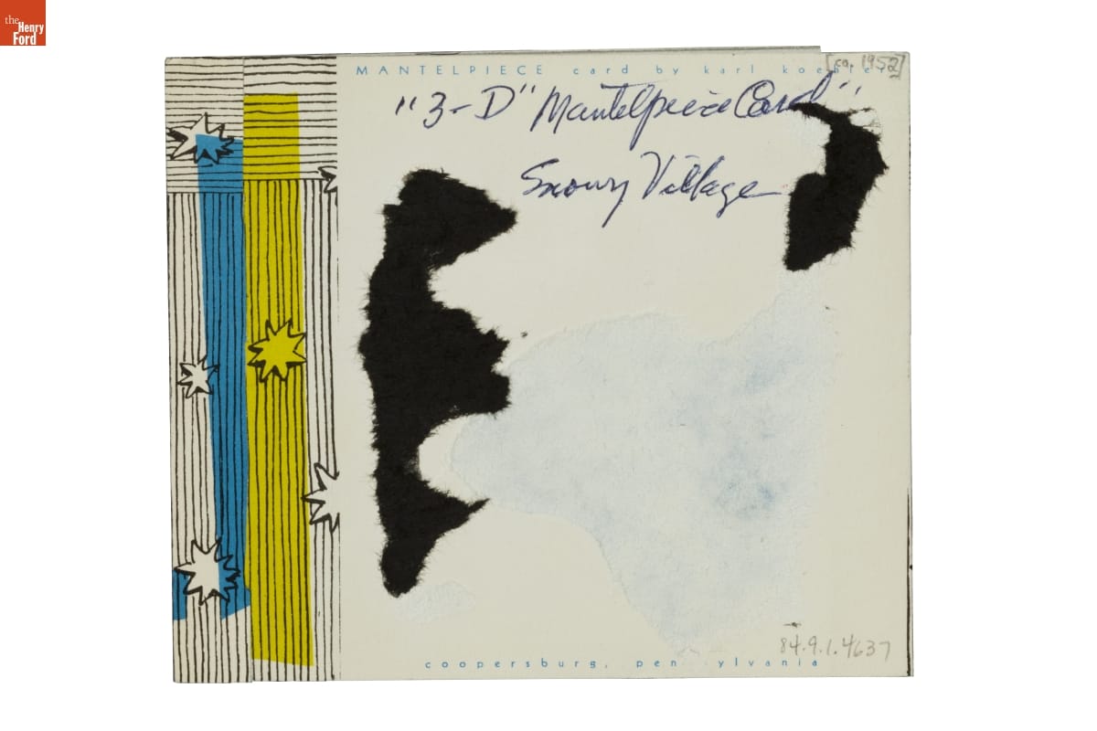Karl Koehler designed three-dimensional Christmas cards in the late 1940s and 1950s. He folded, scored, and snipped paper printed with his artwork, then assembled the cards in his studio. Koehler's creations folded flat for mailing, but when opened they brought unexpected joy with their pop-out shapes. Holiday shoppers found his line of "Mantelpiece" cards at high-end department stores throughout the country.