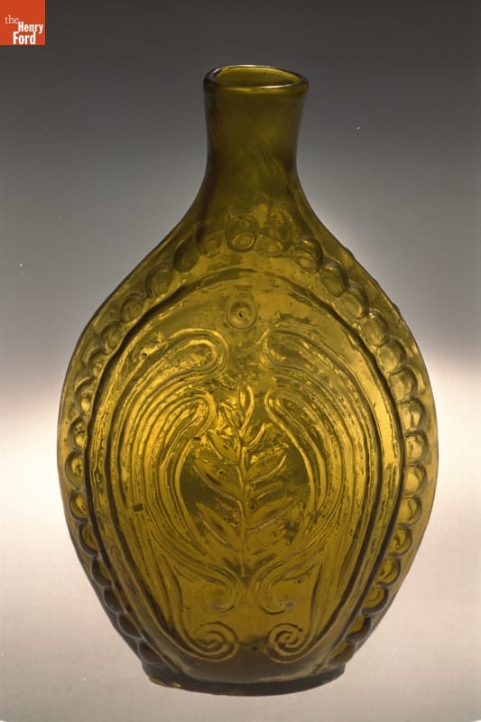 Glass factories in America began producing inexpensive, mold-formed flasks in the early 1800s. These figured flasks, often decorated with symbols of national pride or political or cultural affiliation, appealed to America's common man. Many flasks, like this one, contain images of an eagle -- a traditional symbol for America.