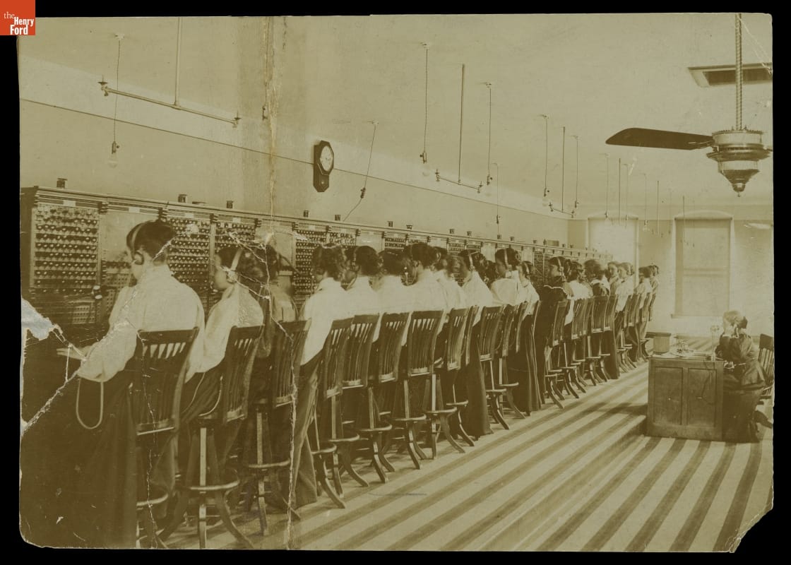 This photograph shows 21 telephone operators working at a wall switchboard. The chief operator and supervisor, Amanda Hitchcock, is seated at a desk, speaking into a phone; telephone exchanges were predominantly run by female employees. Before direct-dialing was possible, callers would dial the operator, who would then assist by using cords or switches to manually patch their destination connection.