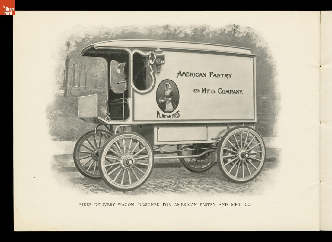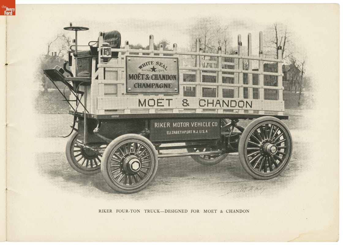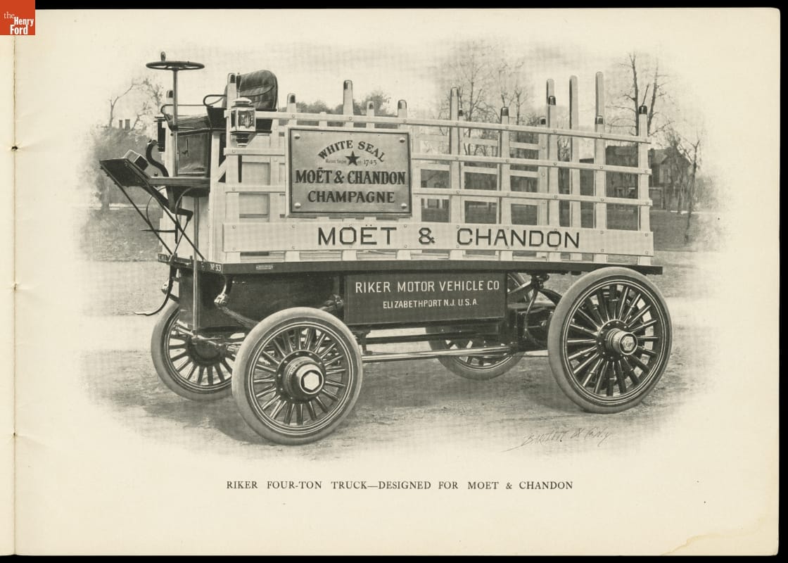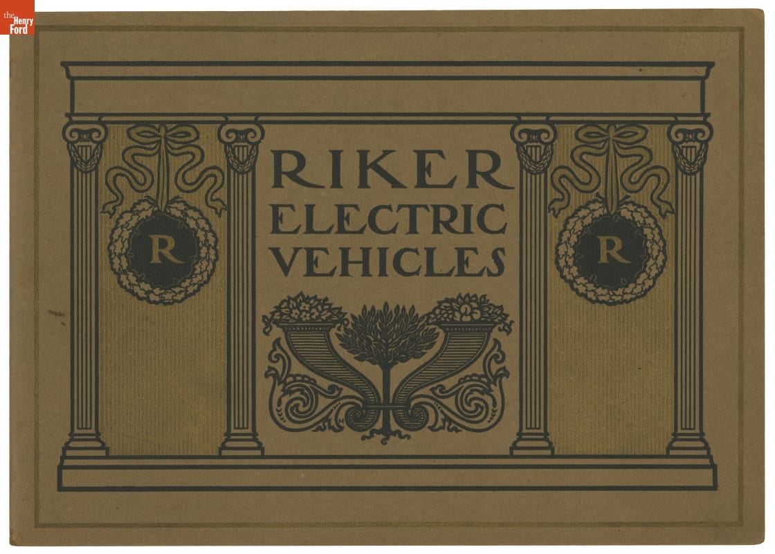 The Riker Electric Vehicle Company, formed by inventor Andrew Riker, became known for producing electric touring cars and commercial trucks. This catalog from 1900 shows the company's line of electric vehicles. Riker later developed internal-combustion engines for the Locomobile Company of America.