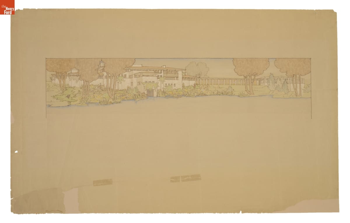 Scholars have known that Henry Ford approached Frank Lloyd Wright to design his home. This drawing is evidence that Wright worked on the project before his departure for Europe in September 1909. The commission then went to Wright's assistant, Marion Mahony, who submitted this rendering to Clara Ford in February 1914. Soon after, Henry Ford replaced Mahony with William Van Tine, who completed the house.
