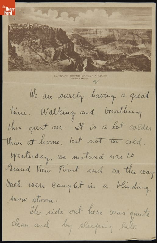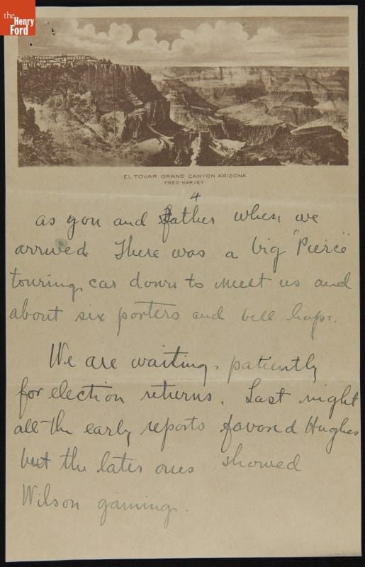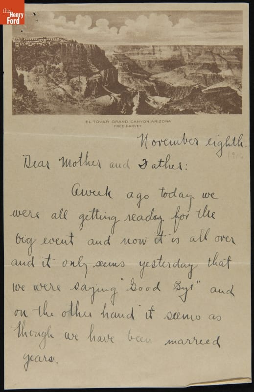 After their wedding on November 1, 1916, Edsel and Eleanor Ford traveled to the West Coast before sailing to Hawaii. Along the way, the couple stopped and visited the Grand Canyon. Edsel penned this brief letter to his parents in which he recounts some of the events during the newlyweds' stay: a blinding snowstorm, Presidential election returns, and "real cow boy life."