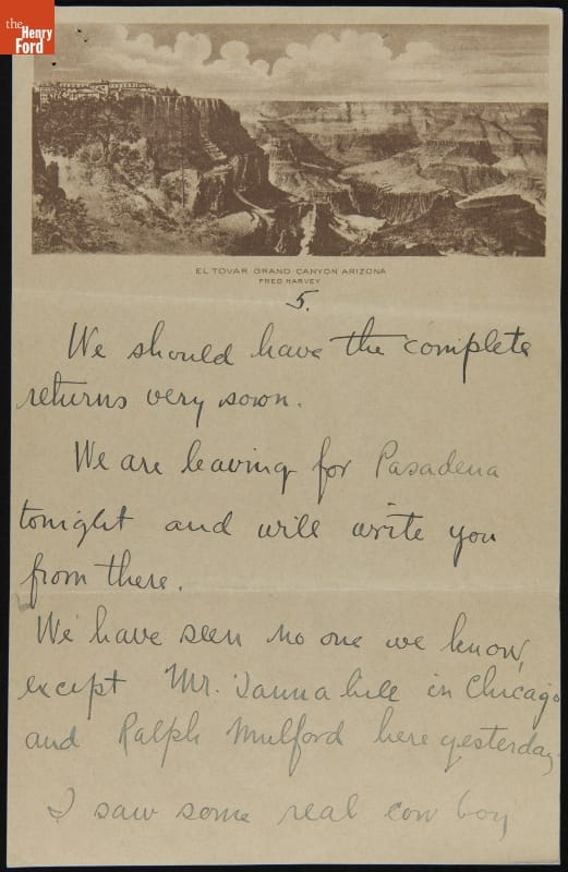 After their wedding on November 1, 1916, Edsel and Eleanor Ford traveled to the West Coast before sailing to Hawaii. Along the way, the couple stopped and visited the Grand Canyon. Edsel penned this brief letter to his parents in which he recounts some of the events during the newlyweds' stay: a blinding snowstorm, Presidential election returns, and "real cow boy life." …