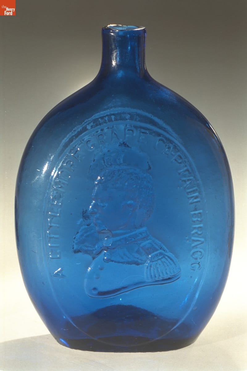 Glass factories in America began producing inexpensive, mold-formed flasks in the early 1800s. These figured flasks, often decorated with symbols of national pride, appealed to America's common man. This flask pairs Mexican War hero General Zachary Taylor with America's founding father, George Washington. The inscription around Taylor's image refers to his order to fire more artillery rounds -- and alluded to the flask's alcoholic content.
