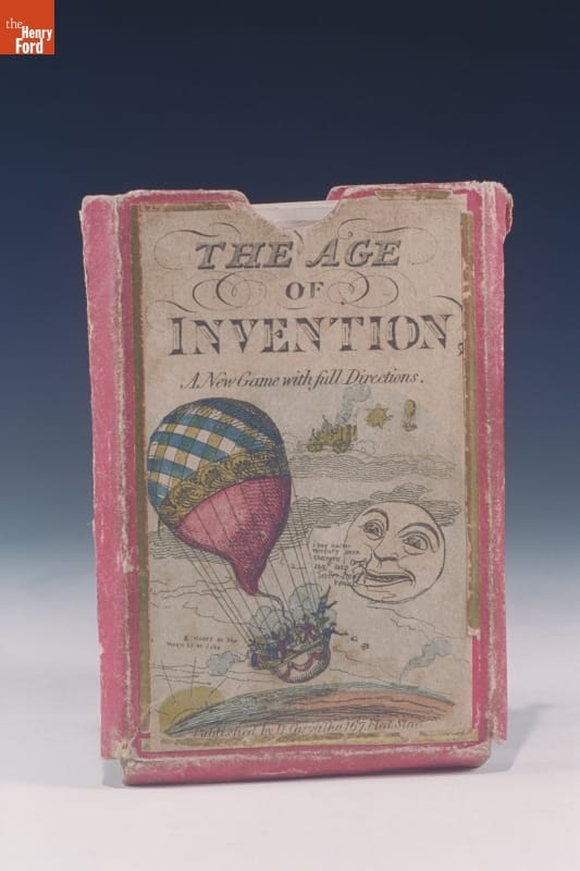 This box contained a set of printed cards with images of mid-19th century events and inventions. Each card was given a value, and those of higher value trumped all others. Players could be entertained by either playing the game or discussing the colorful illustrations of history and innovation.