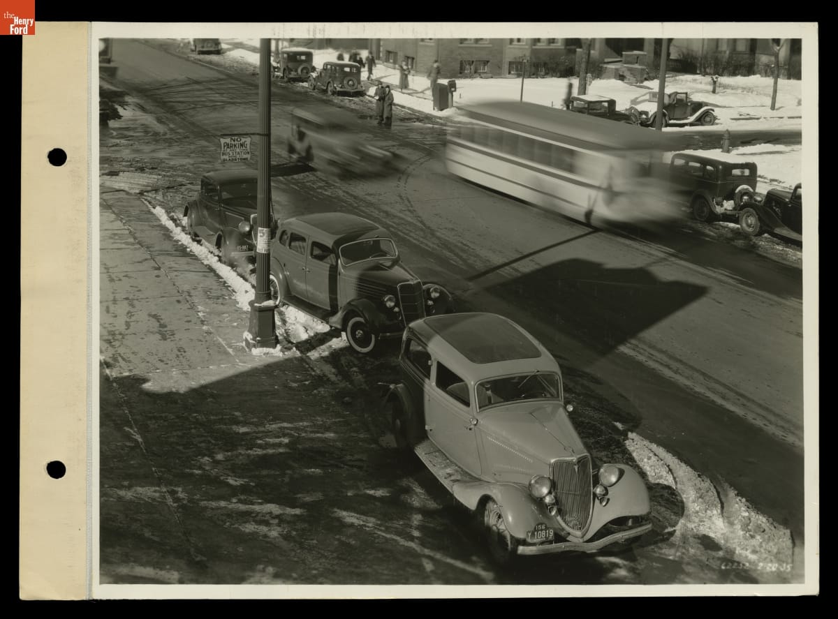 Ford V-8 Automobiles Parked under a No Parking Sign, 1935