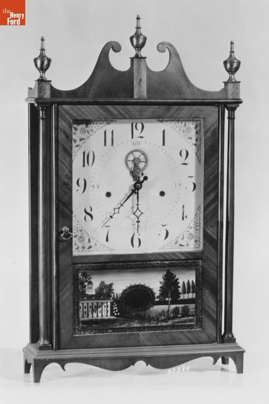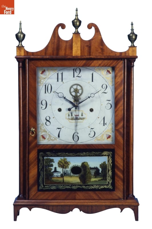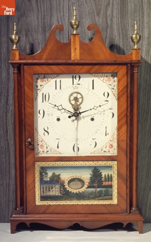 Eli Terry pioneered the use of interchangeable wooden parts to make his clock works inexpensive. He combined this with a second innovation, his standardized "pillar and scroll" shelf clock, consisting of decorative pillars, supporting a scrolled top, a painted dial, above a reverse painted, decorative scene. For the first time clocks were affordable to all Americans, not just the wealthy.