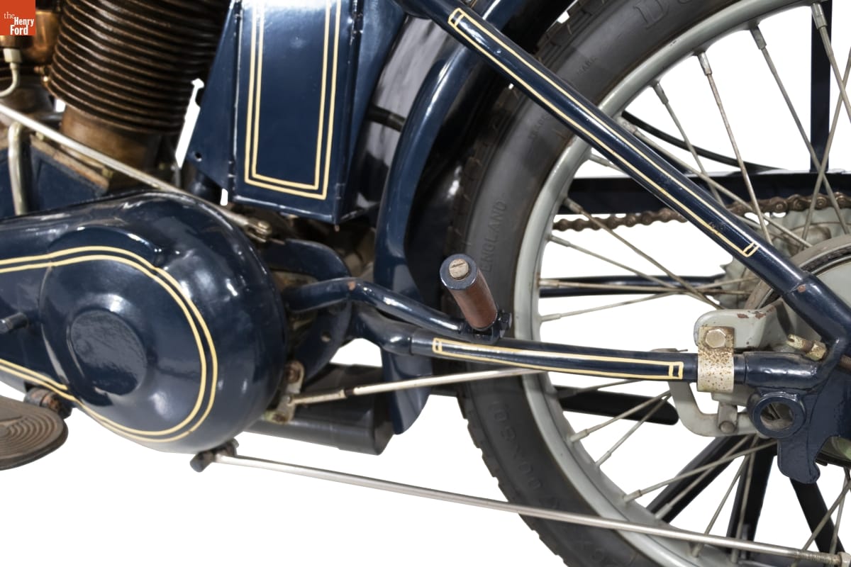 Saddle: MESINGER / [in a circle] / CUSHION SUSPENSION Gas tank: In "X" logo upper quadrant: EXCELSIOR Left quadrant: Motor Co. Right quadrant: and / Supply Bottom quadrant: Chicago, USA On tire: DUNLAP TIRES DUNLAP CORD MOTORCYCLE EXTRA HEAVY MADE IN ENGLAND