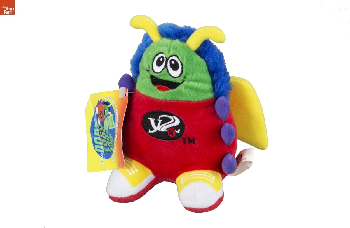 on front: Y2K on front of tag sewn on bottom of toy: y2K / TM 1998 LOOKING GLASS PARTNERS, LLC on back of tag sewn on bottom of toy: NOT FOR CHILDREN UNDER 3 YEARS / REG. NO. PA 5782 (HK) / ALL NEW MATERIALS / PLASTIC PELLETS/POLYESTER FIBERS / SURFACE WASHABLE / ©1998 PRINCESS SOFT TOYS, INC. / MINNEAPOLIS, MN 55439 / MADE IN CHINA ASI 36235 on front of hang tag: PRINCESS SOFT TOYS PRESENTS / OFFICIAL MERCHANDISE OF THE 21ST CENTURY / FOR THE YEAR 2000 AND BEYOND on back of hang tag: Perpetual curiosity has taken this inquisitive little bug just about everywhere in the world of technology. This guy is here to help find those other pesky computer bugs who are just as mischievous, but not so cute. / Y2K is a registered trademark and licensed property available exclusively through Looking Glass Partners, LLC. Princess Soft Toys, Inc. is a licensee. / Printed in China / (C) Princess Soft Toys / Minneapolis, MN 55439