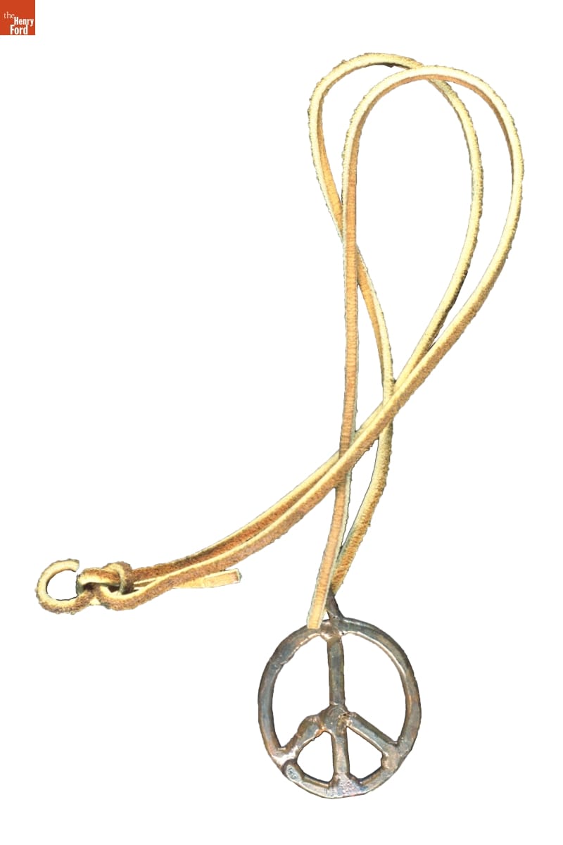 The "peace sign" was first designed in 1958 as part of the British Campaign for Nuclear Disarmament. By the late 1960s and 1970s, the symbol -- shown on this necklace -- came to mean that the wearer was an opponent of the Vietnam War. Ultimately, the peace sign came to represent opposition to war in general.