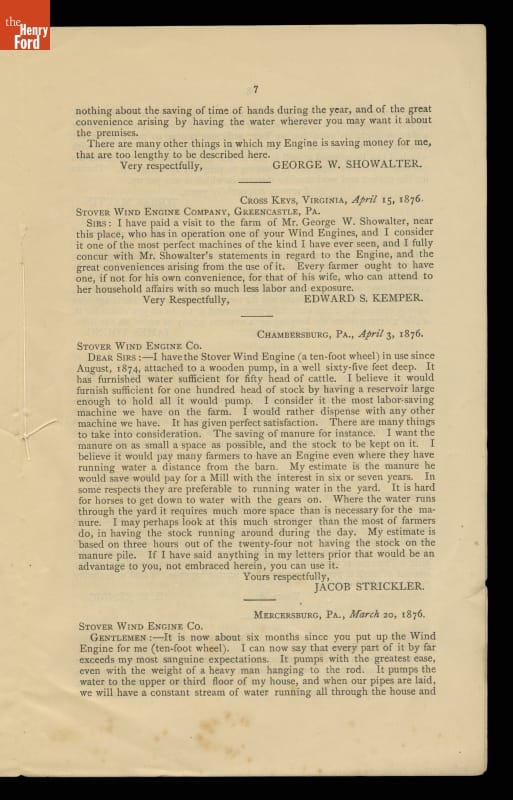 Many American farmers in the late 1800s bought windmills to pump water and power machinery. The Stover Wind Engine Company -- one of several companies that used the Stover name -- manufactured windmills for a brief period around the late 1870s. With pages of testimonials, this Stover catalog touted the durable construction and labor- and money-saving qualities of its windmills.