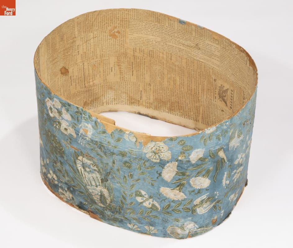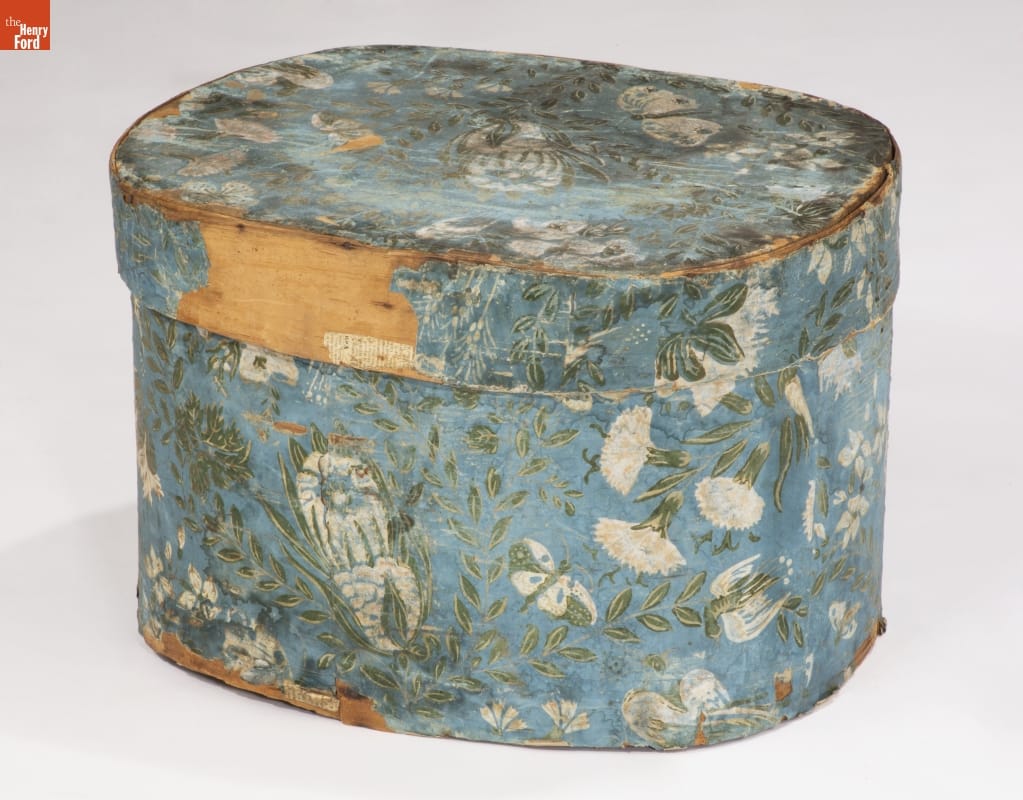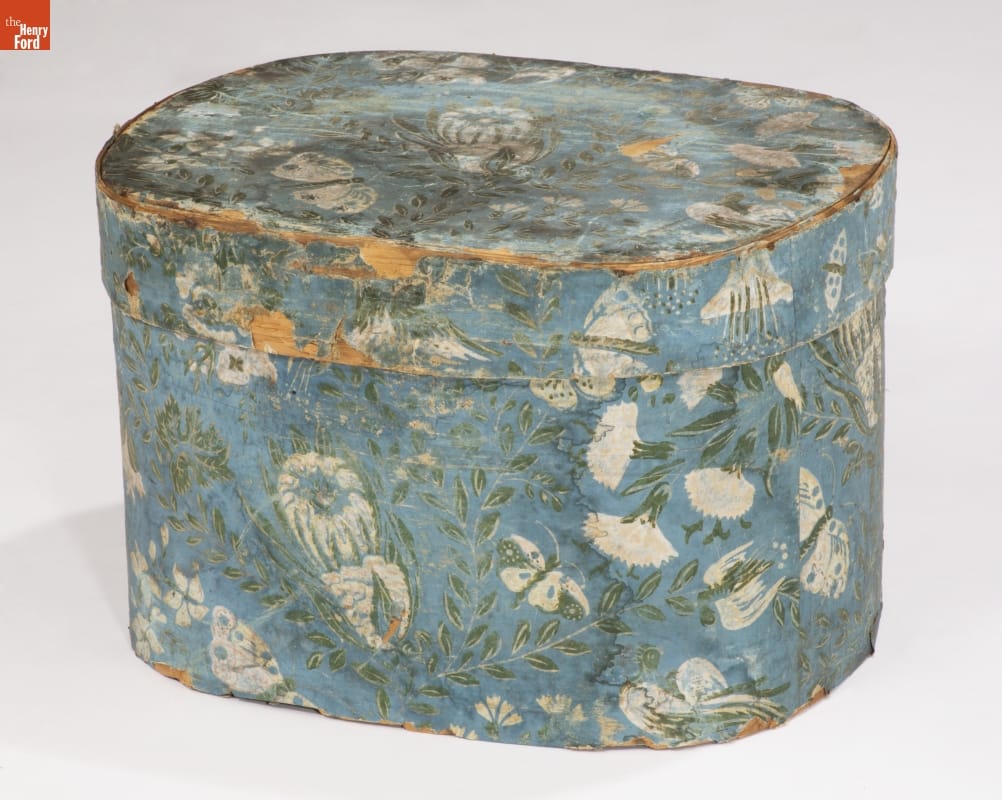 Hannah Davis (1784-1863), a Jaffrey, New Hampshire, entrepreneur, created colorful, wallpaper-covered bandboxes. Davis sold many of her bandboxes to the young, migrant women who worked in the textile mills in the surrounding New England villages. Davis's attractive and affordable bandboxes were ideal for the millworkers. The boxes could hold clothing and accessories and they served as useful storage cases when the women traveled home.