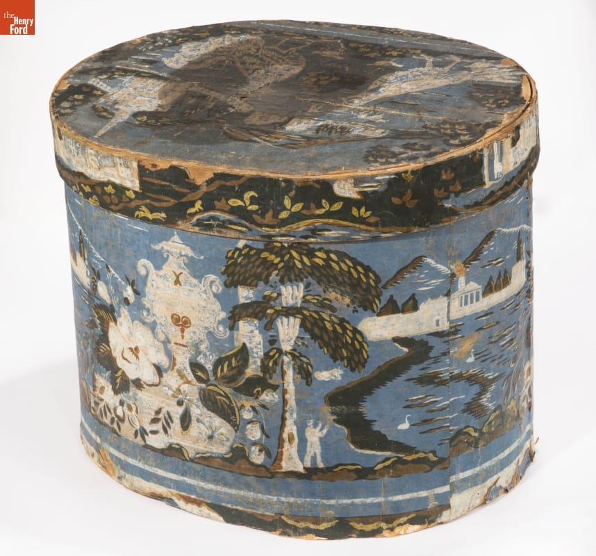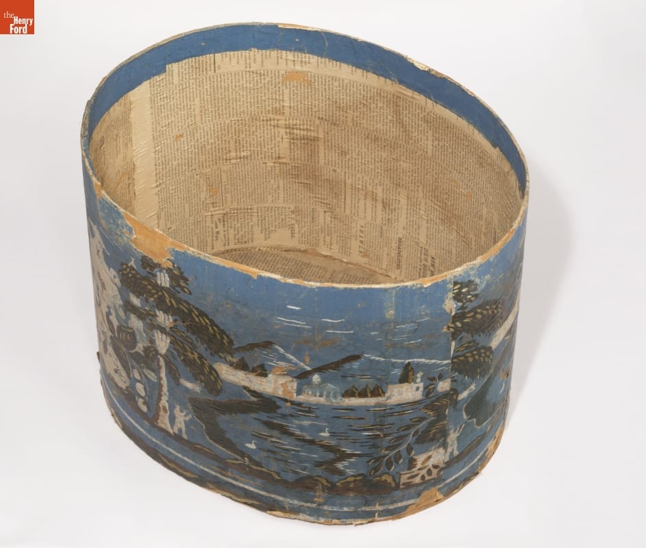 Hannah Davis (1784-1863), a Jaffrey, New Hampshire, entrepreneur, created colorful, wallpaper-covered bandboxes. Davis sold many of her bandboxes to the young, migrant women who worked in the textile mills in the surrounding New England villages. Davis's attractive and affordable bandboxes were ideal for the millworkers. The boxes could hold clothing and accessories and they served as useful storage cases when the women traveled home.