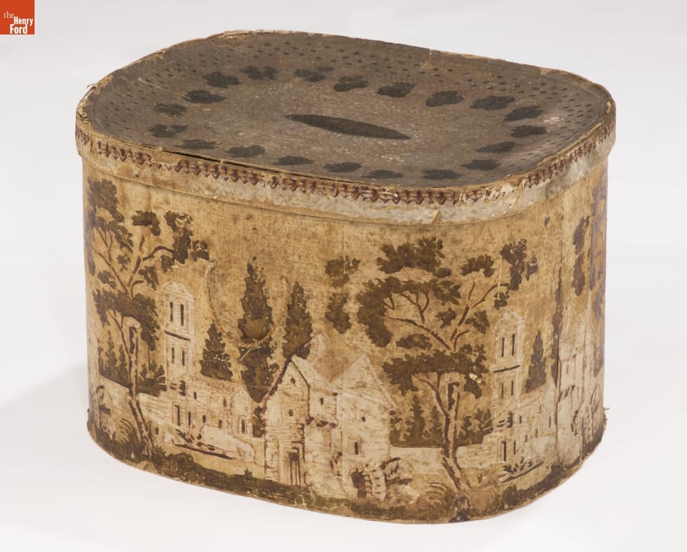 In the early 1800s, Americans used bandboxes to store clothing, accessories, and other small items. Bandboxes were handy containers in the home or when traveling by stage, boat, or rail. Manufacturers covered these inexpensive pasteboard or wooden boxes with colorful papers. This bandbox's paper depicts an idyllic scene with a towered home and mill.