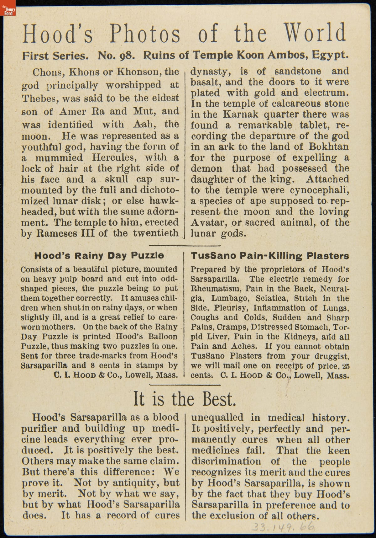 Trade Card for C.I. Hood & Co. with Hood's Photos of the World, "Ruins of Temple Koon Ambos, Egypt," 1890-1910