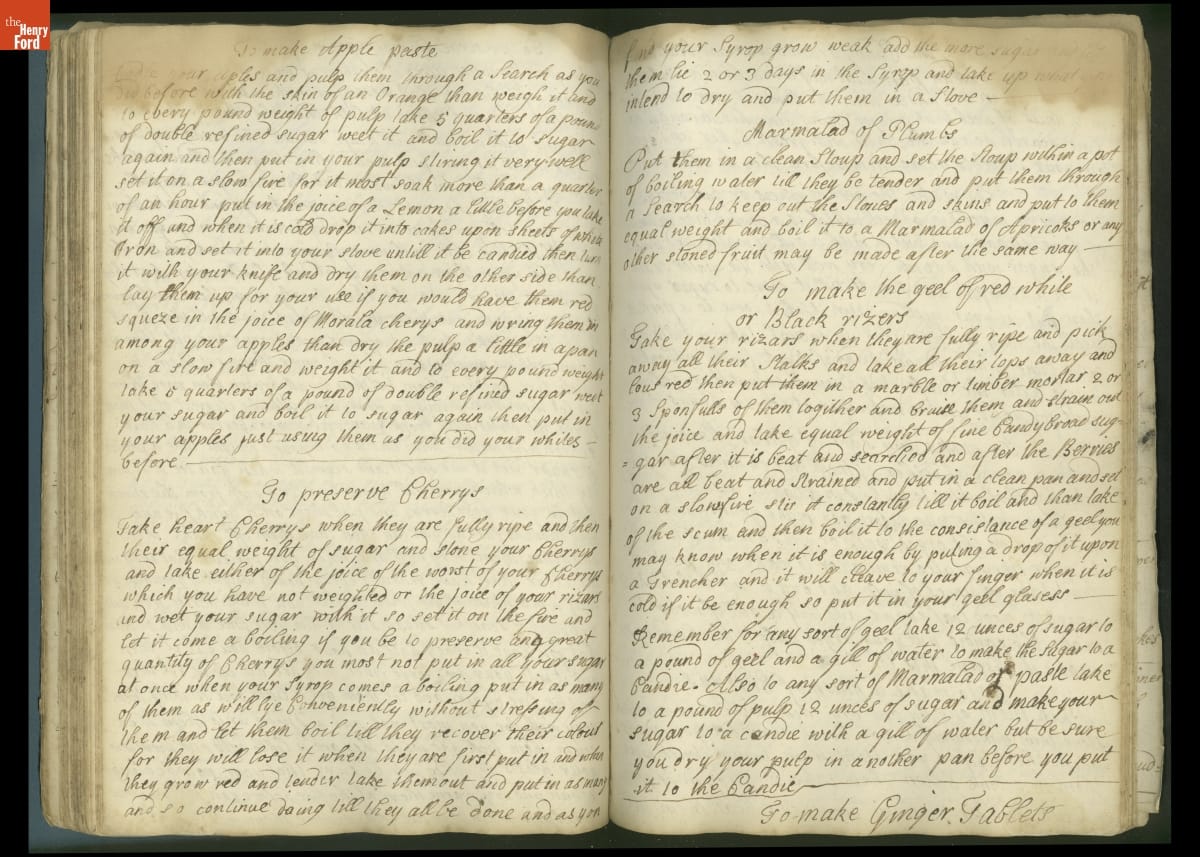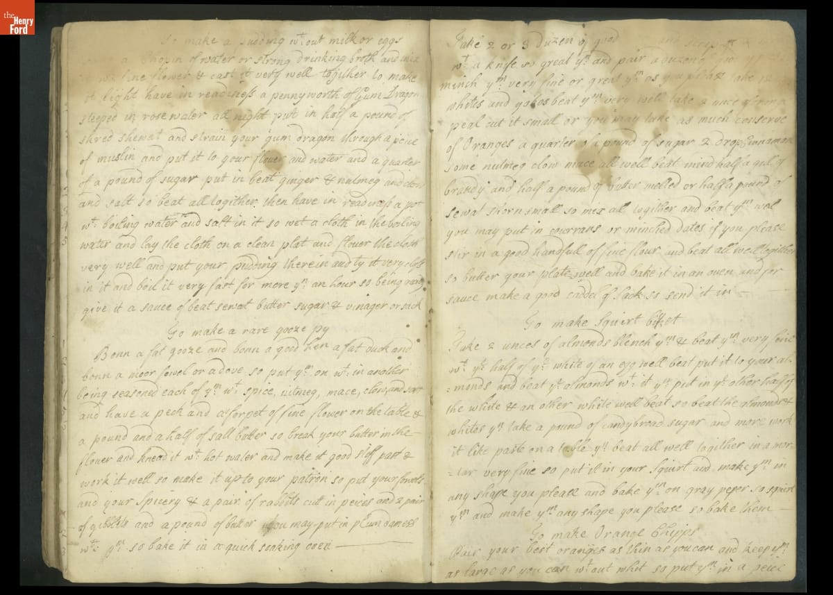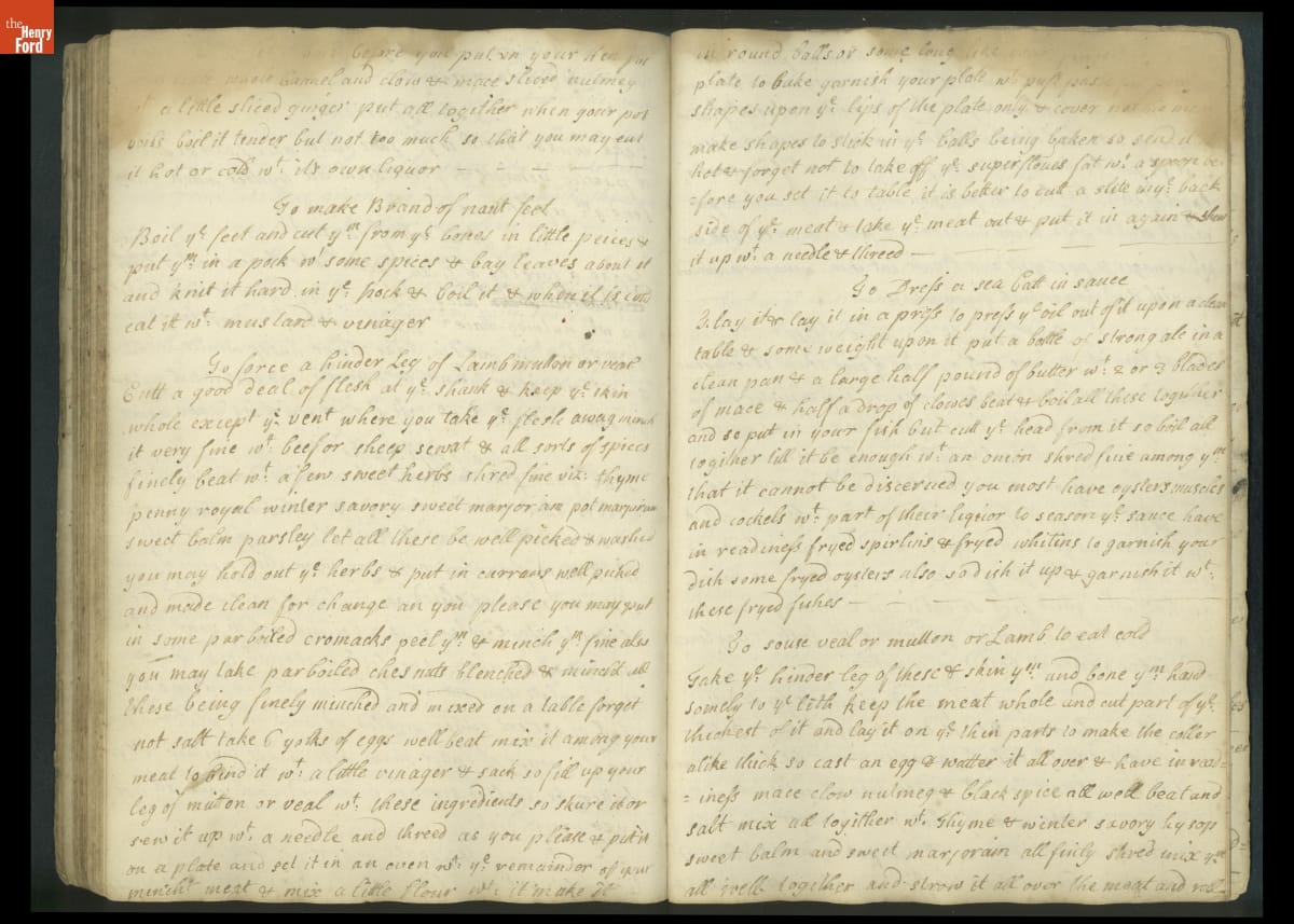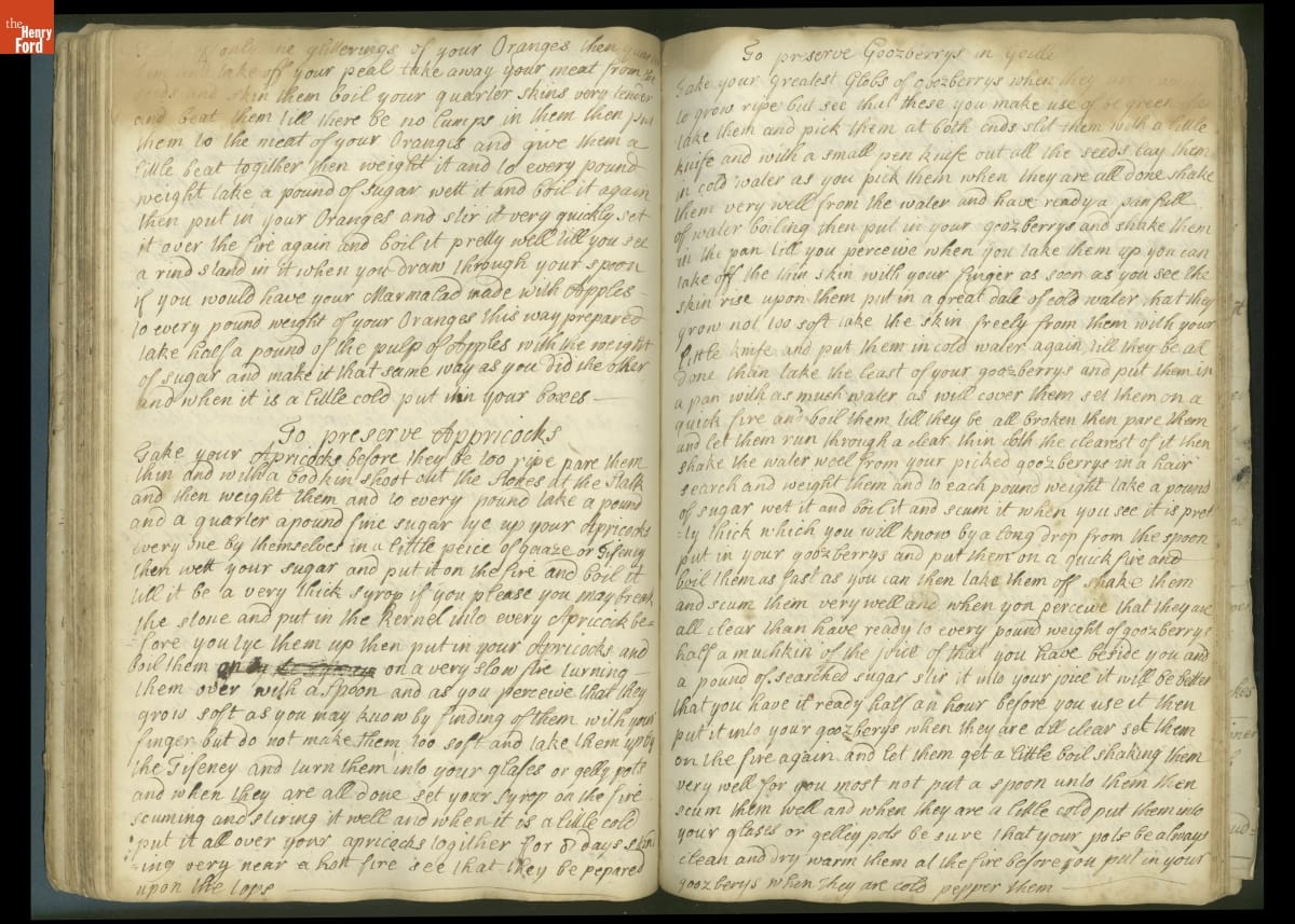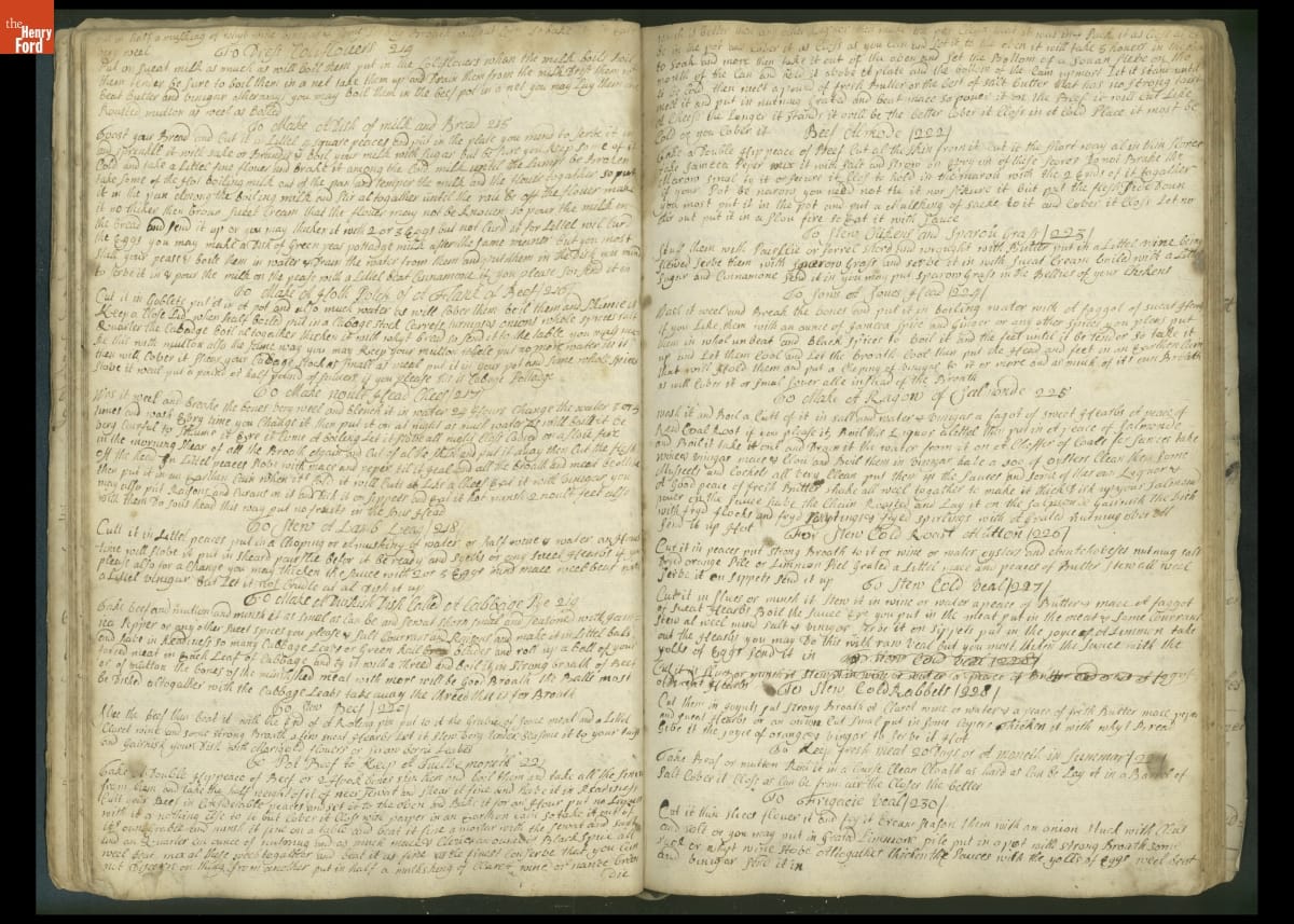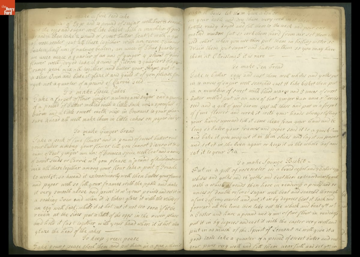 Colonial housewives used recipes handed down from mother to daughter by word of mouth. Women who could read and write might copy down their family recipes in manuscript cookbooks like this one.