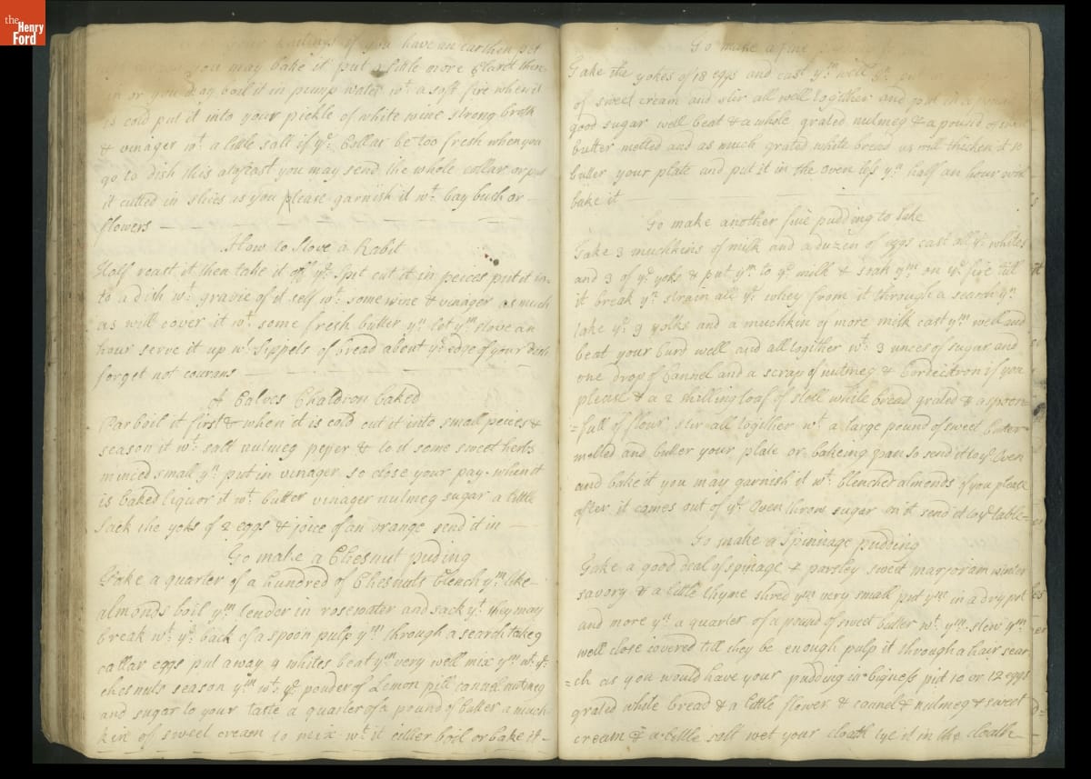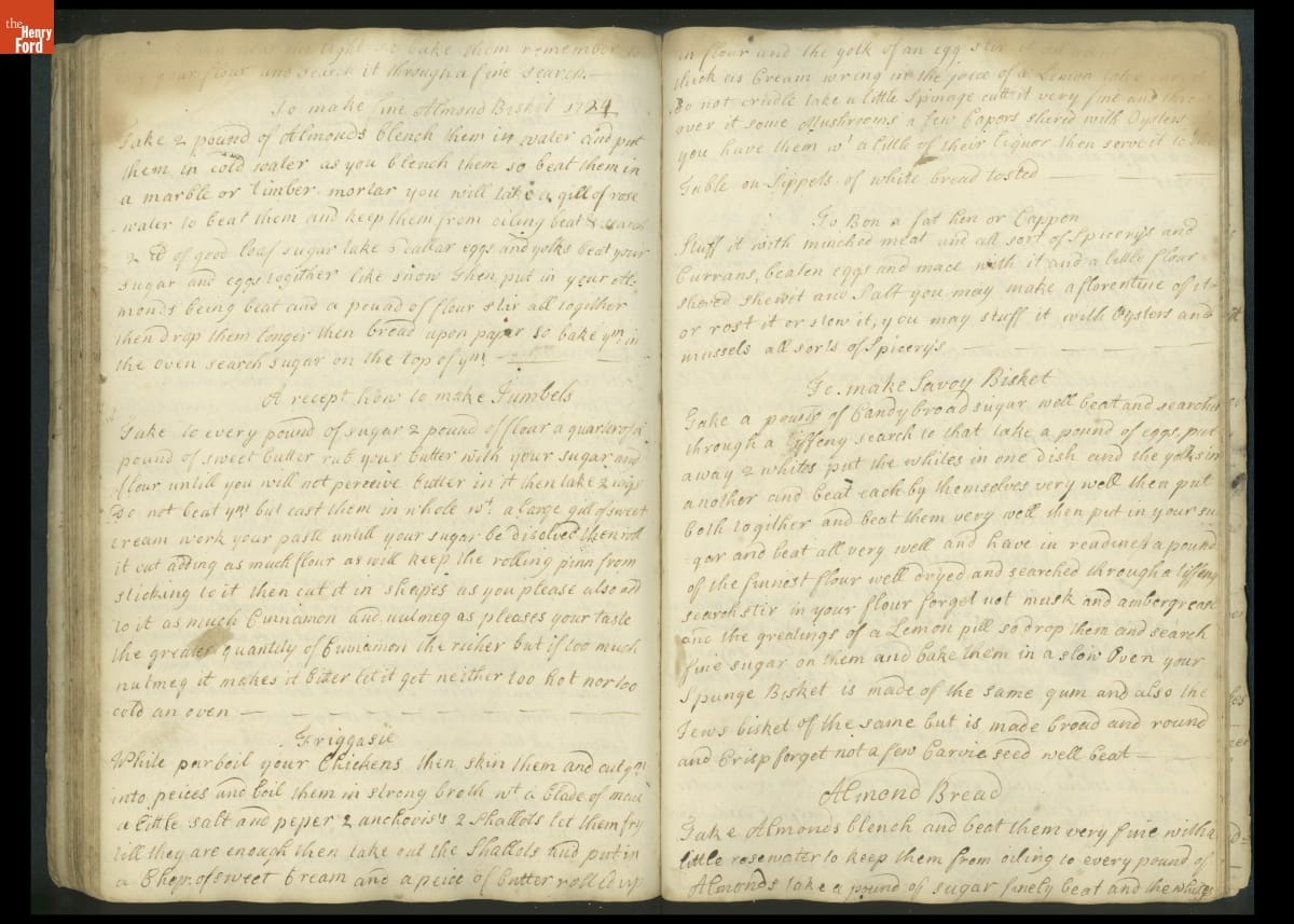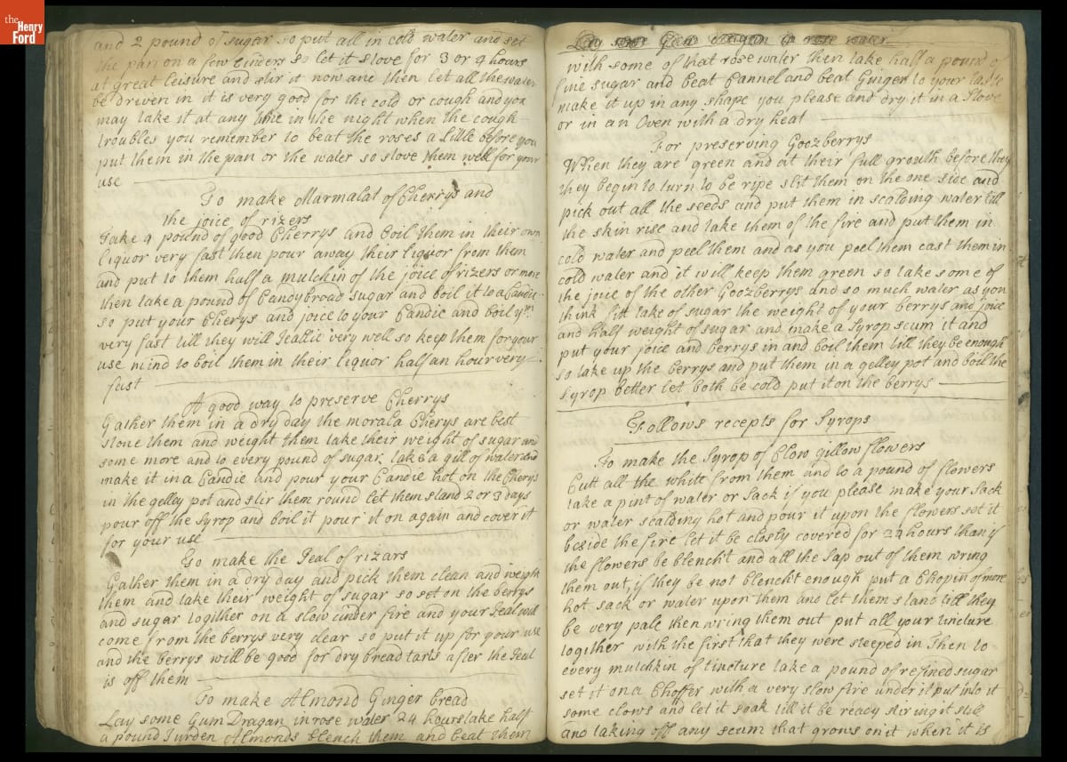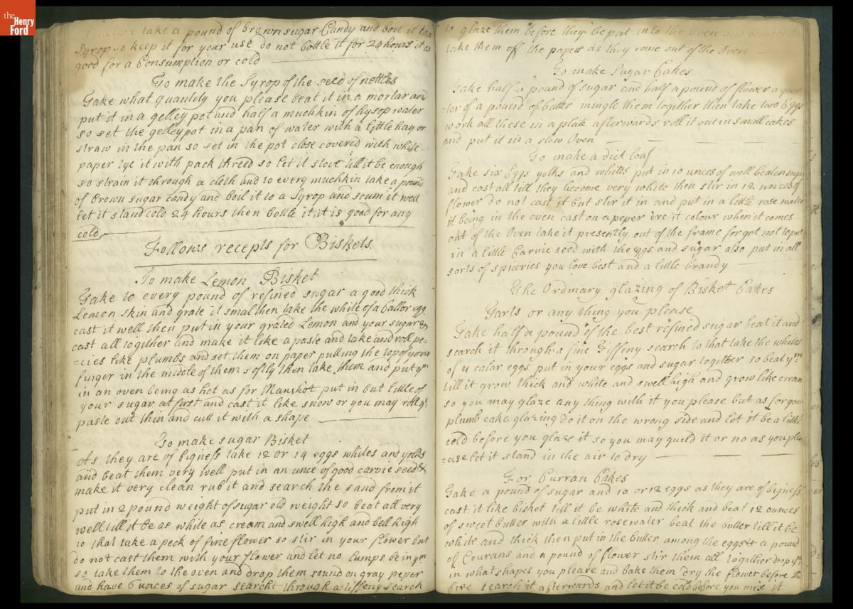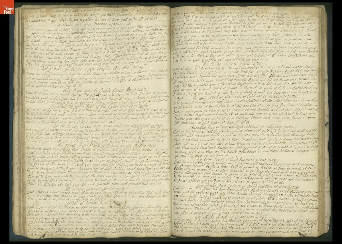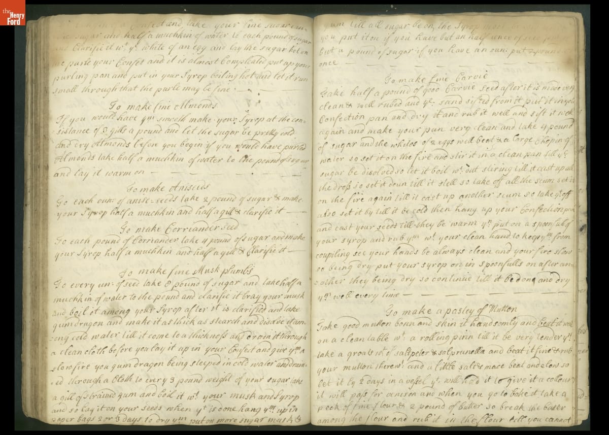 Colonial housewives used recipes handed down from mother to daughter by word of mouth. Women who could read and write might copy down their family recipes in manuscript cookbooks like this one.