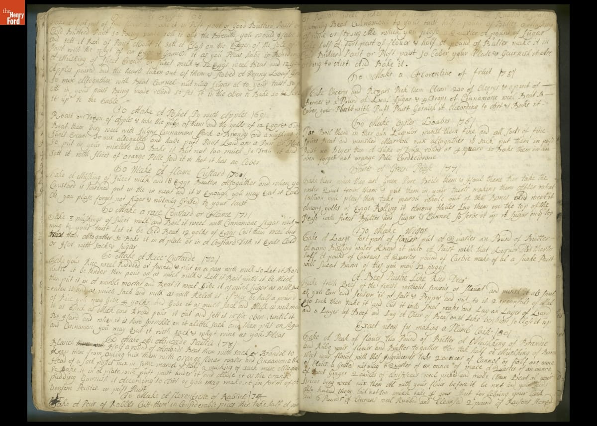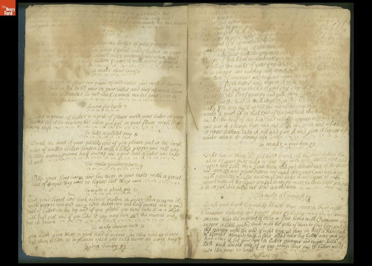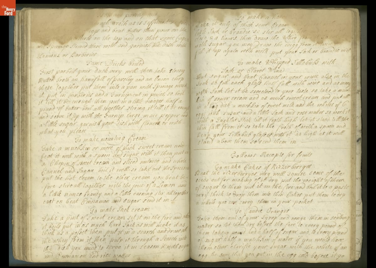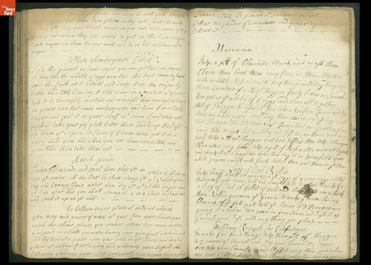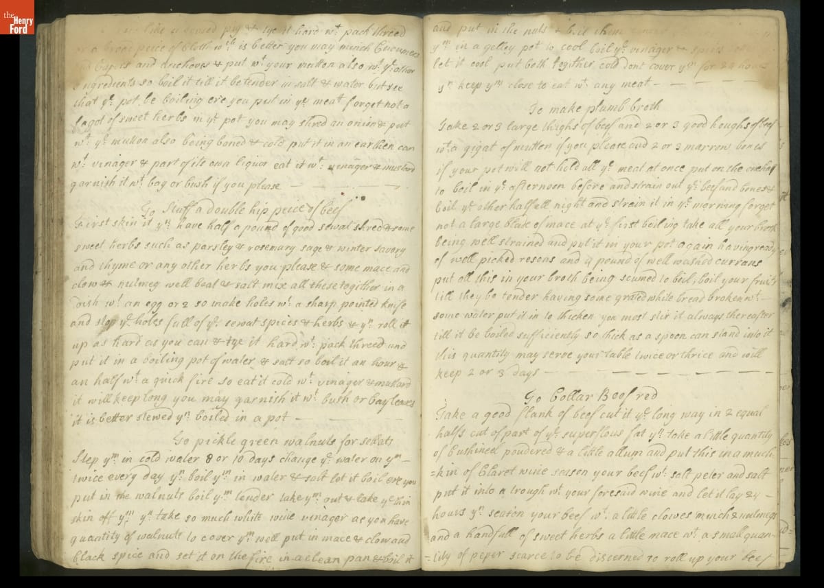 Colonial housewives used recipes handed down from mother to daughter by word of mouth. Women who could read and write might copy down their family recipes in manuscript cookbooks like this one.