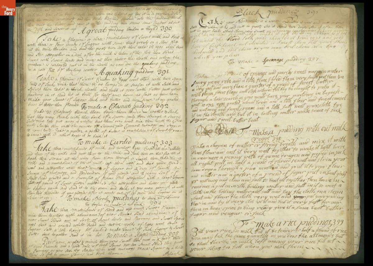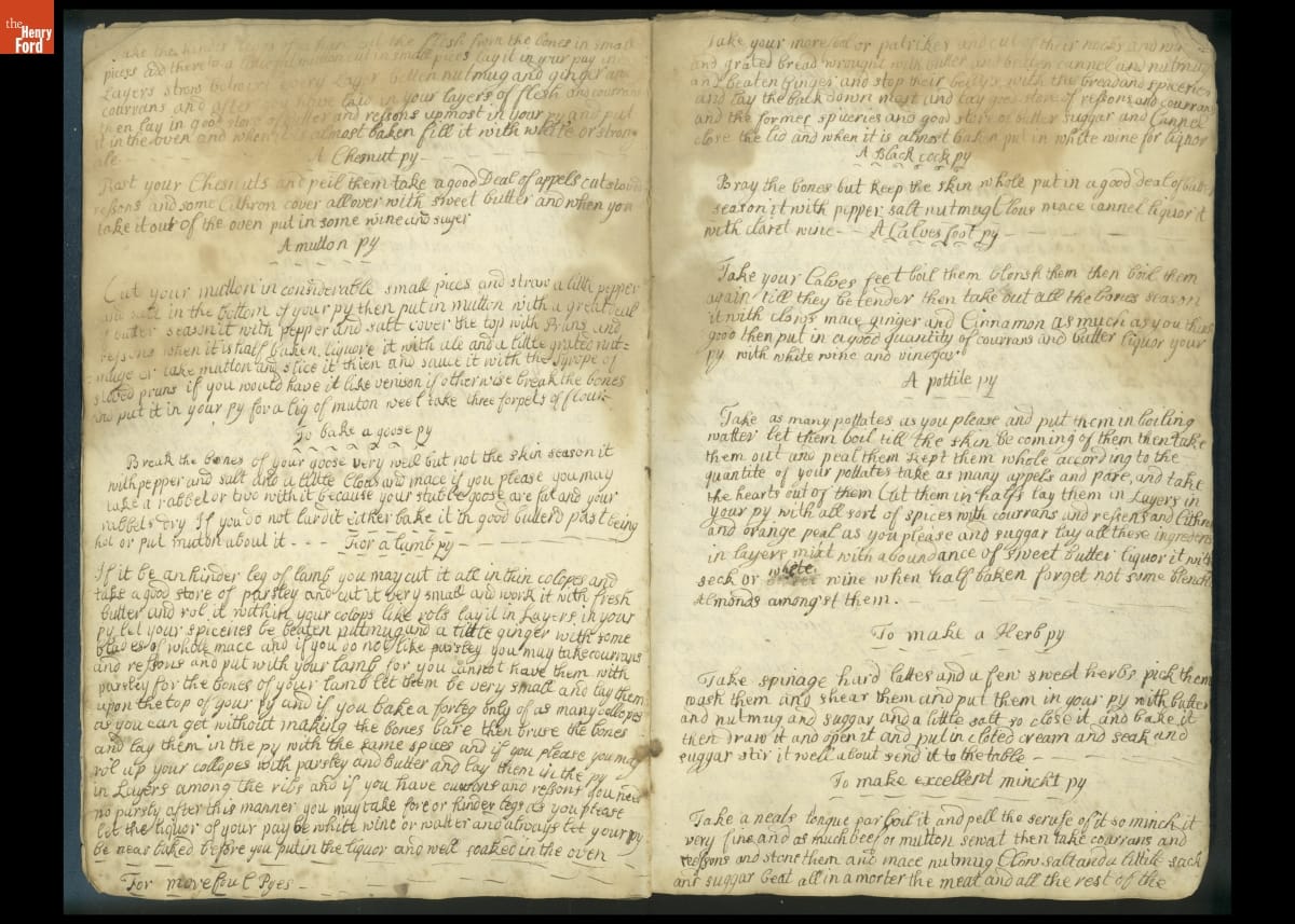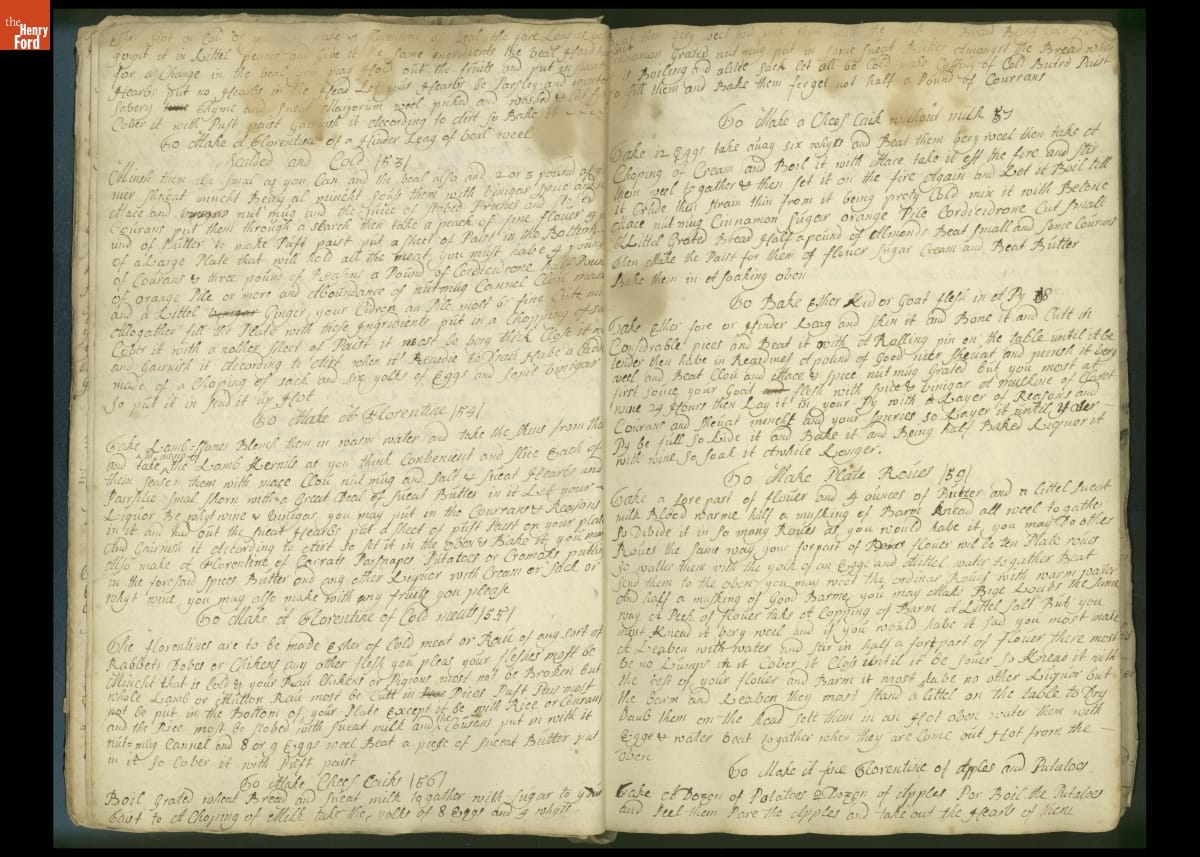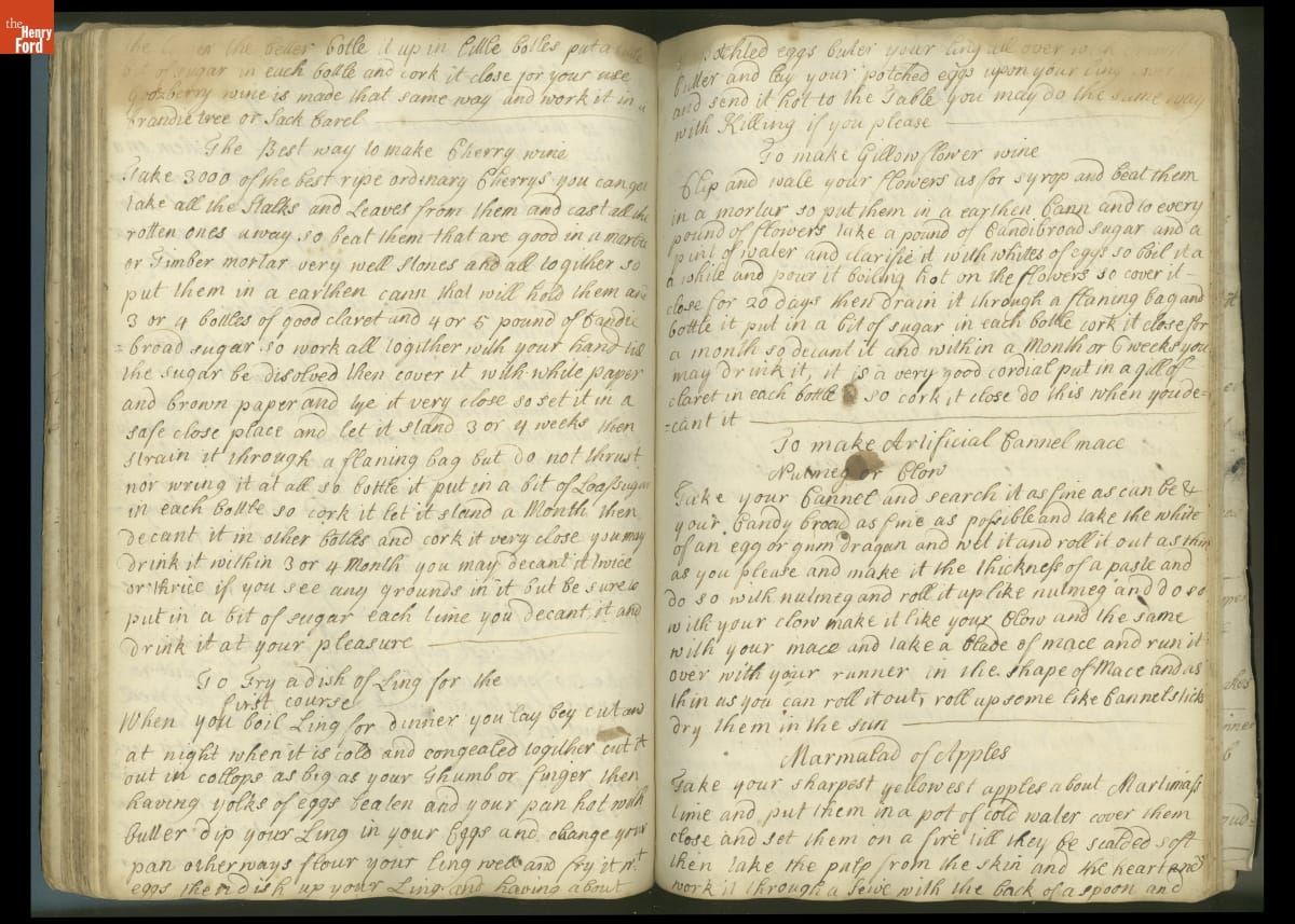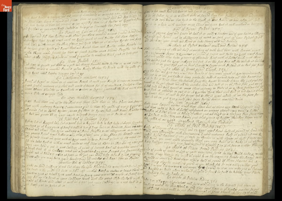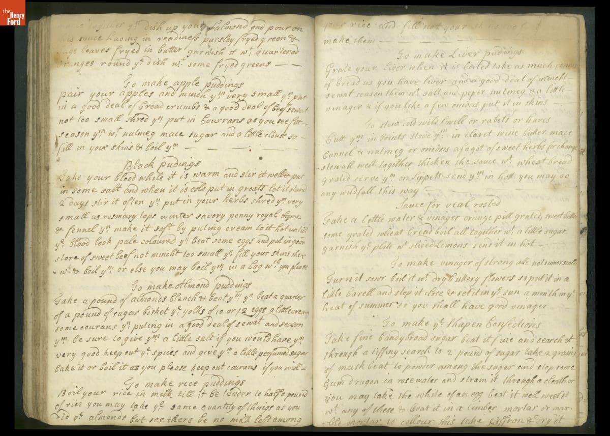 Colonial housewives used recipes handed down from mother to daughter by word of mouth. Women who could read and write might copy down their family recipes in manuscript cookbooks like this one.