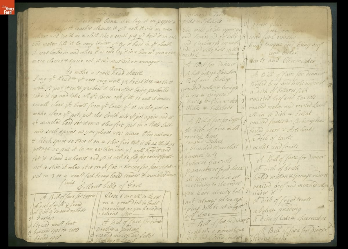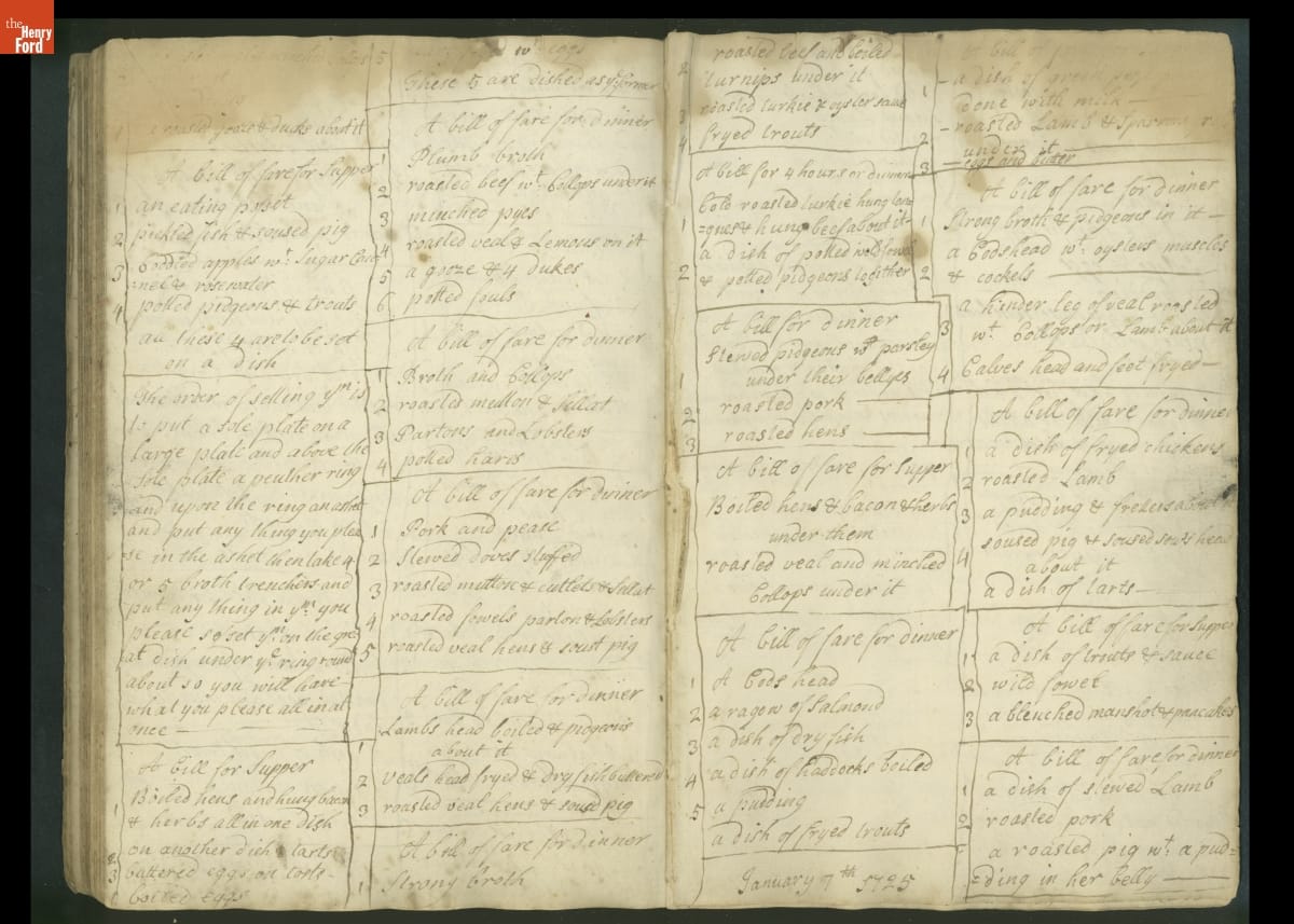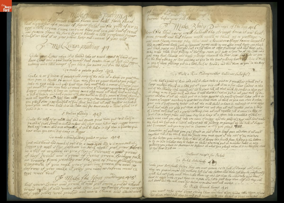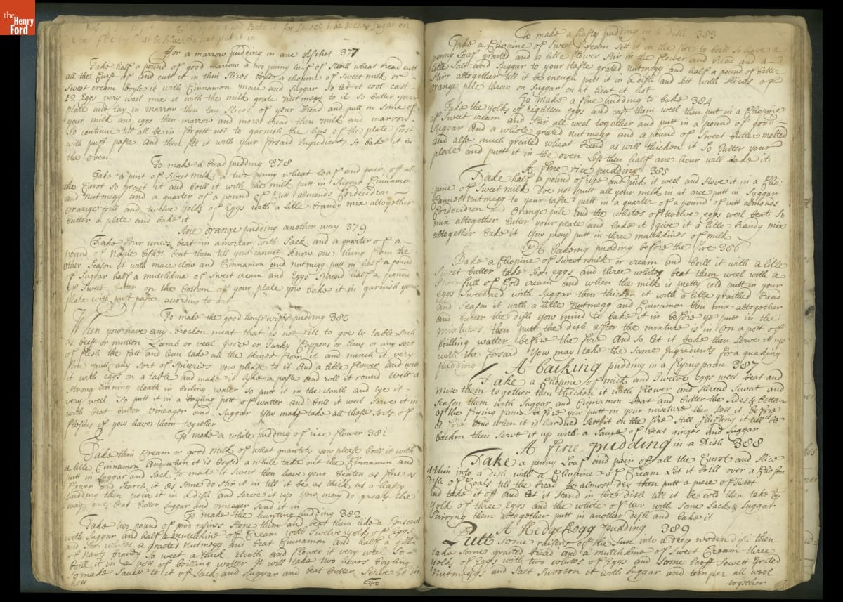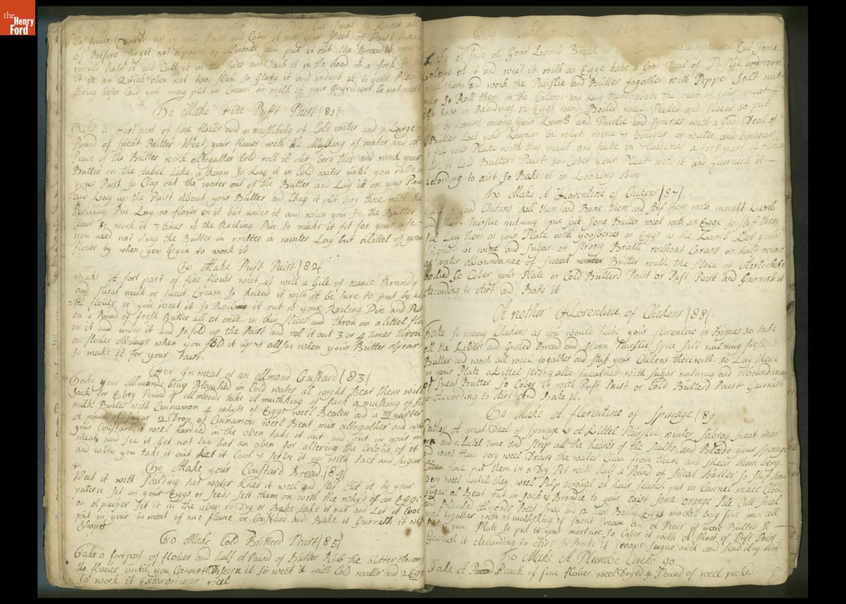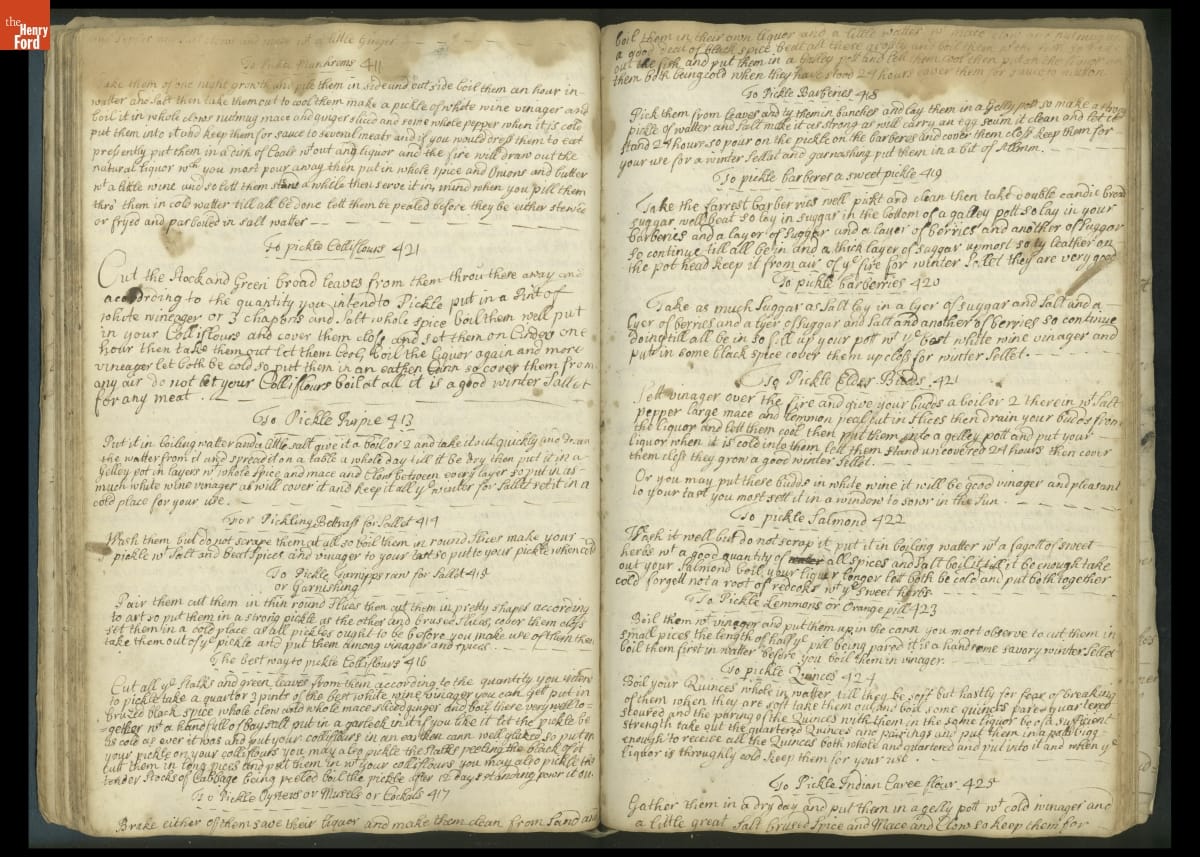 Colonial housewives used recipes handed down from mother to daughter by word of mouth. Women who could read and write might copy down their family recipes in manuscript cookbooks like this one.