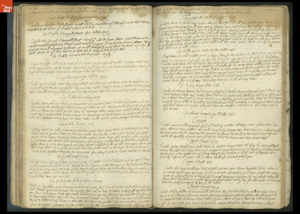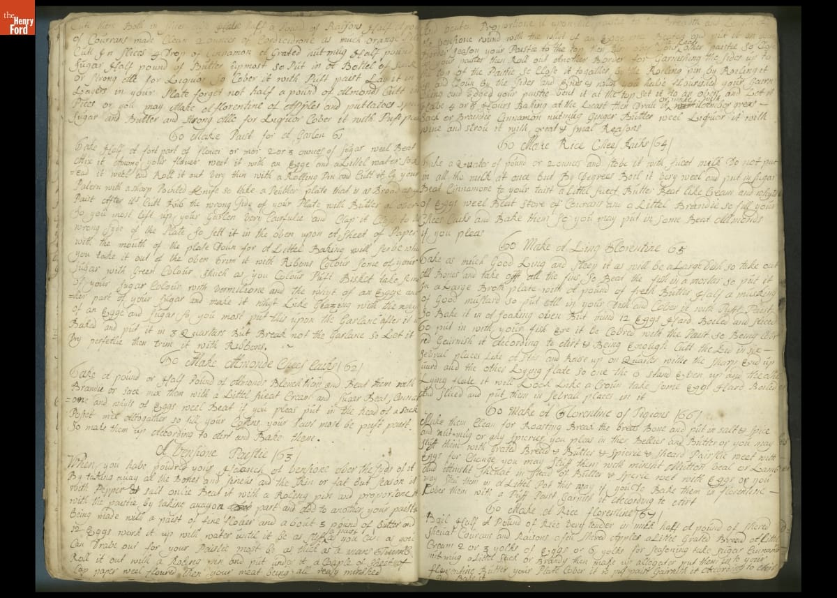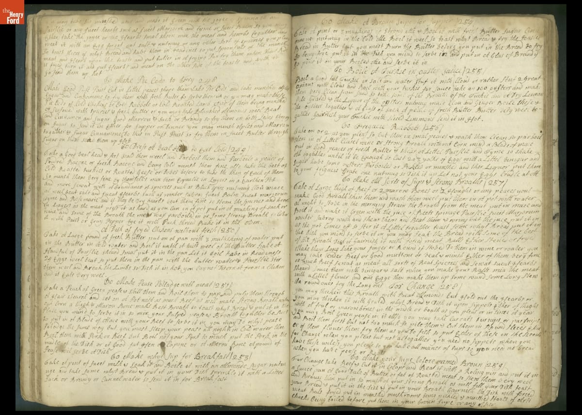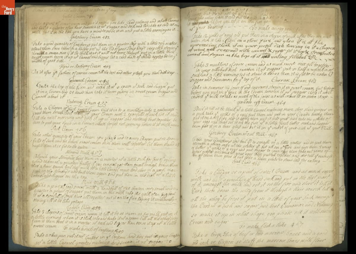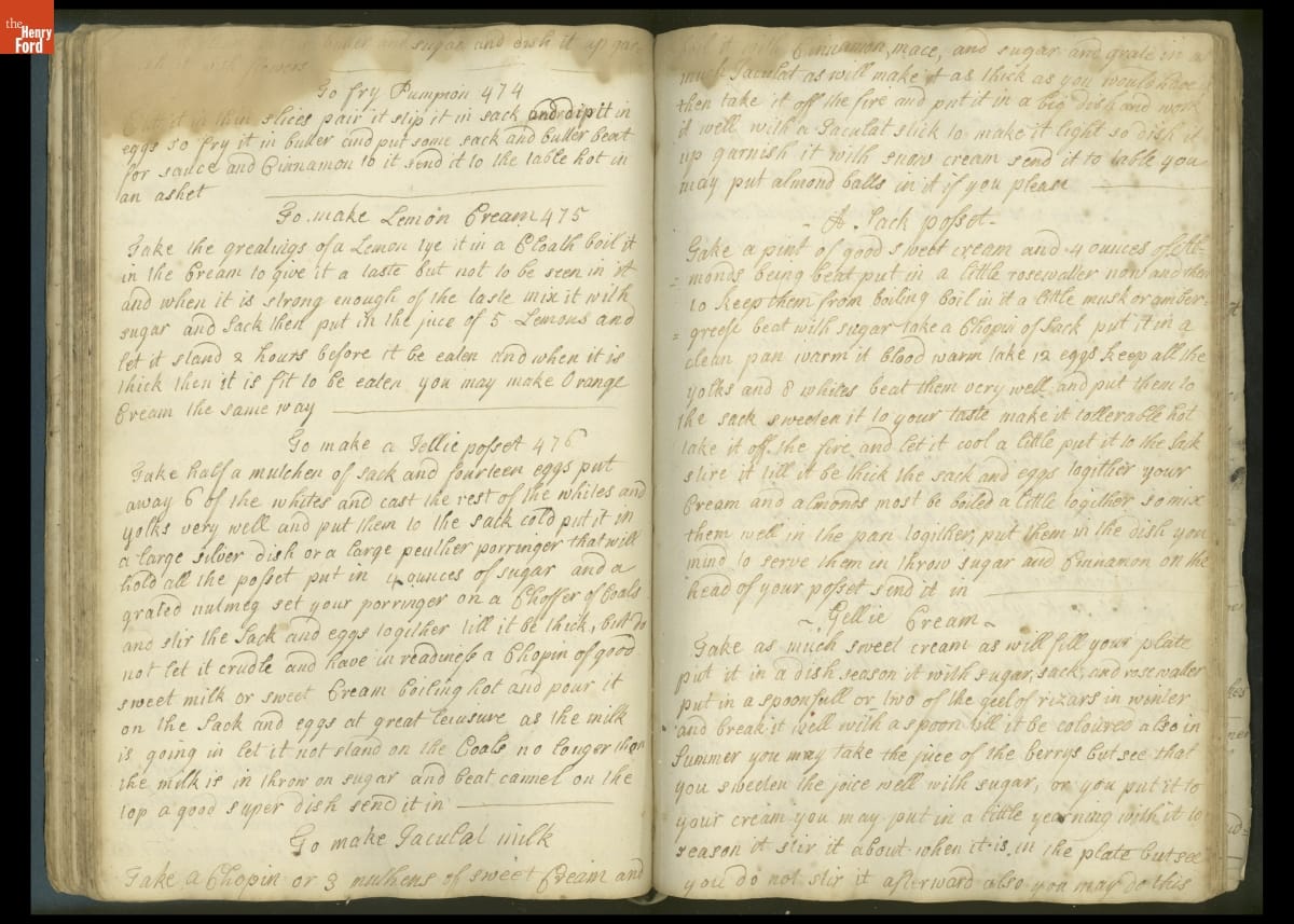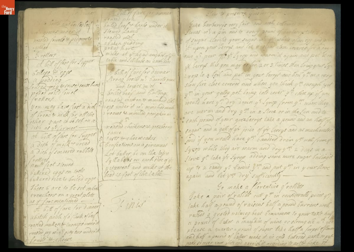 Colonial housewives used recipes handed down from mother to daughter by word of mouth. Women who could read and write might copy down their family recipes in manuscript cookbooks like this one.