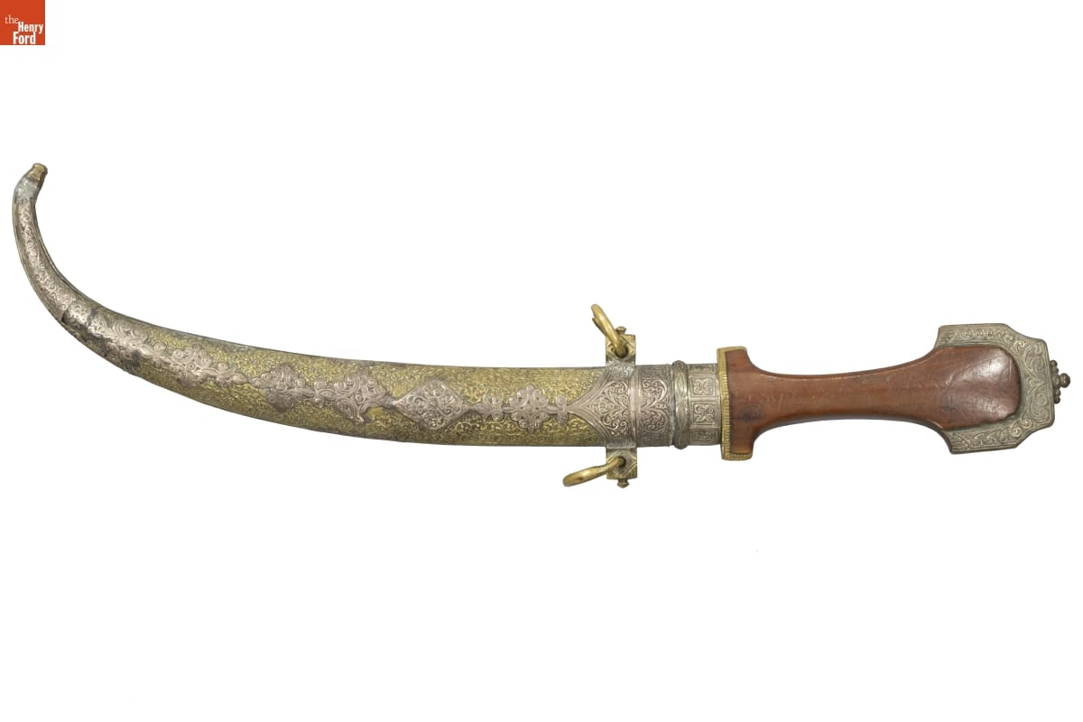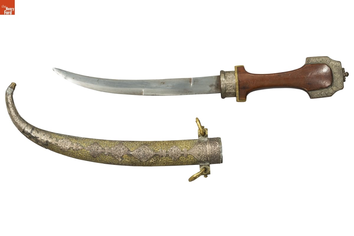 A jambiya is a curved dagger worn close to the body and used for close-at-hand defense. This Moroccan example, from the late 19th or early 20th century, was probably a tourist trade good created for Western consumption. The chasing was executed in a cursory fashion and the inscription, which contains what looks to be Arabic calligraphy, has no meaning.