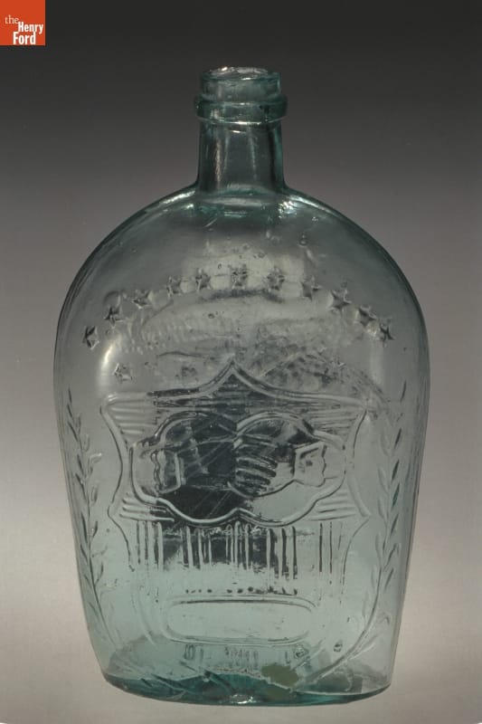 Glass factories in America began producing inexpensive, mold-formed flasks in the early 1800s. These figured flasks, often decorated with symbols of national pride or political or cultural affiliation, appealed to America's common man. The clasping hands, shield and eagle represent the Union -- a cause many Americans fought to uphold during the Civil War.