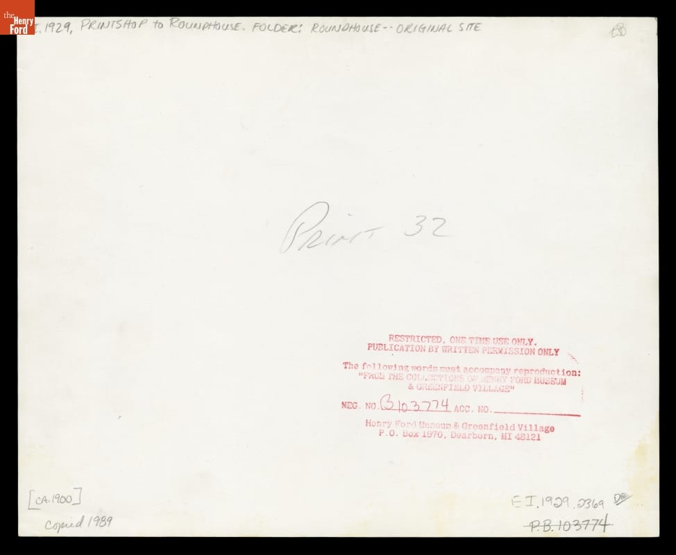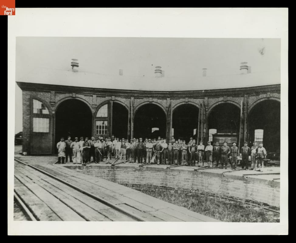 This photograph shows the Detroit, Toledo & Milwaukee Roundhouse in its original location in Marshall, Michigan. The roundhouse's crew is posed in front of the building. Steam locomotives required constant maintenance from an army of skilled and unskilled workers, and the roundhouse is where that work took place.