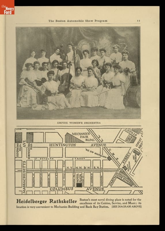 Auto shows use glamour, giveaways, spectacle, and sex appeal to show off manufacturers' latest offerings. Part entertainment and part consumer education, auto shows have their roots in 19th Century industrial exhibitions and world's fairs. New York City hosted America's first auto show in 1900 and the idea caught on. Paying crowds took away this program from the 1908 Boston show.