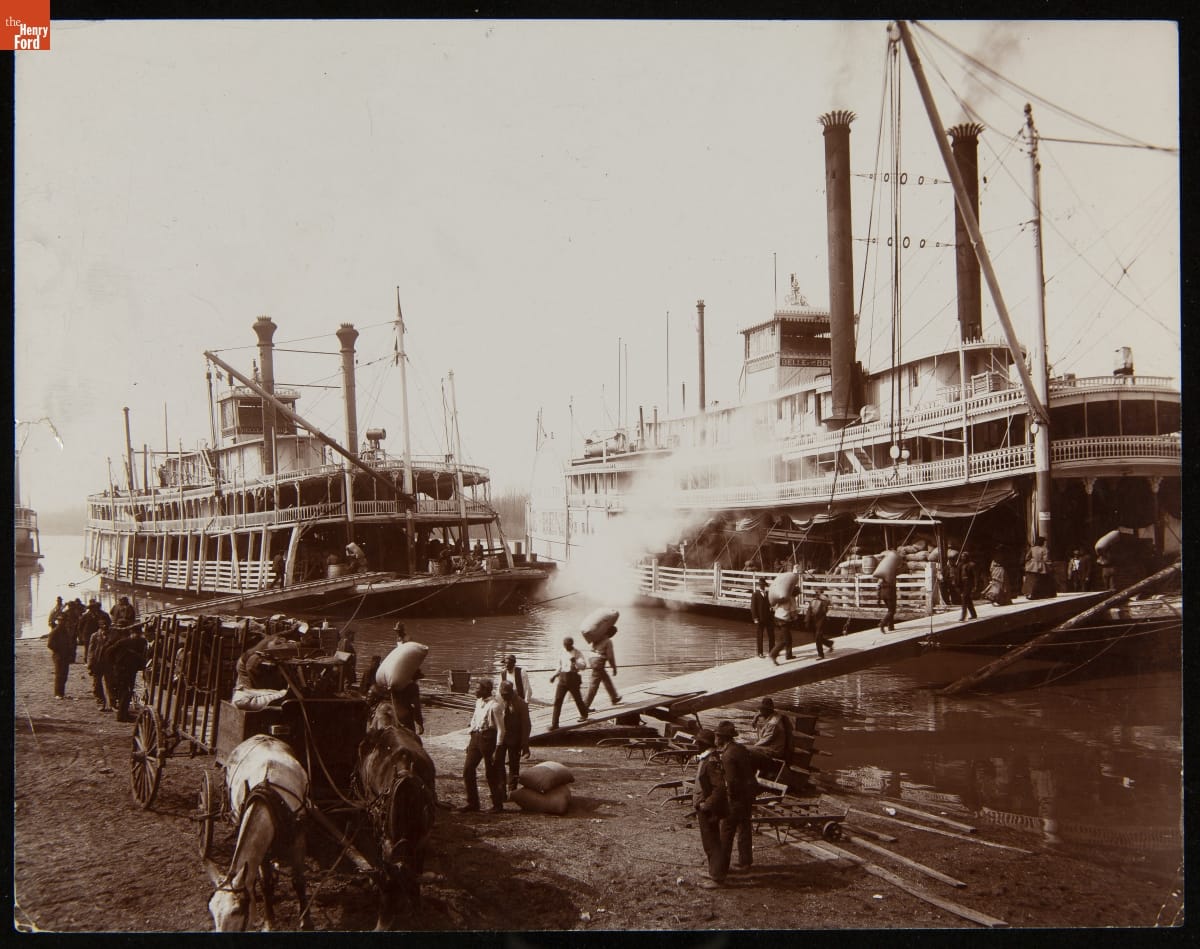 African-American workers carry cargo from horse-drawn wagons onto waiting steamboats. This 1906 photograph was taken at Memphis, Tennessee, along the Mississippi River. Steamboats were still an important freight and travel option into the early 20th century.