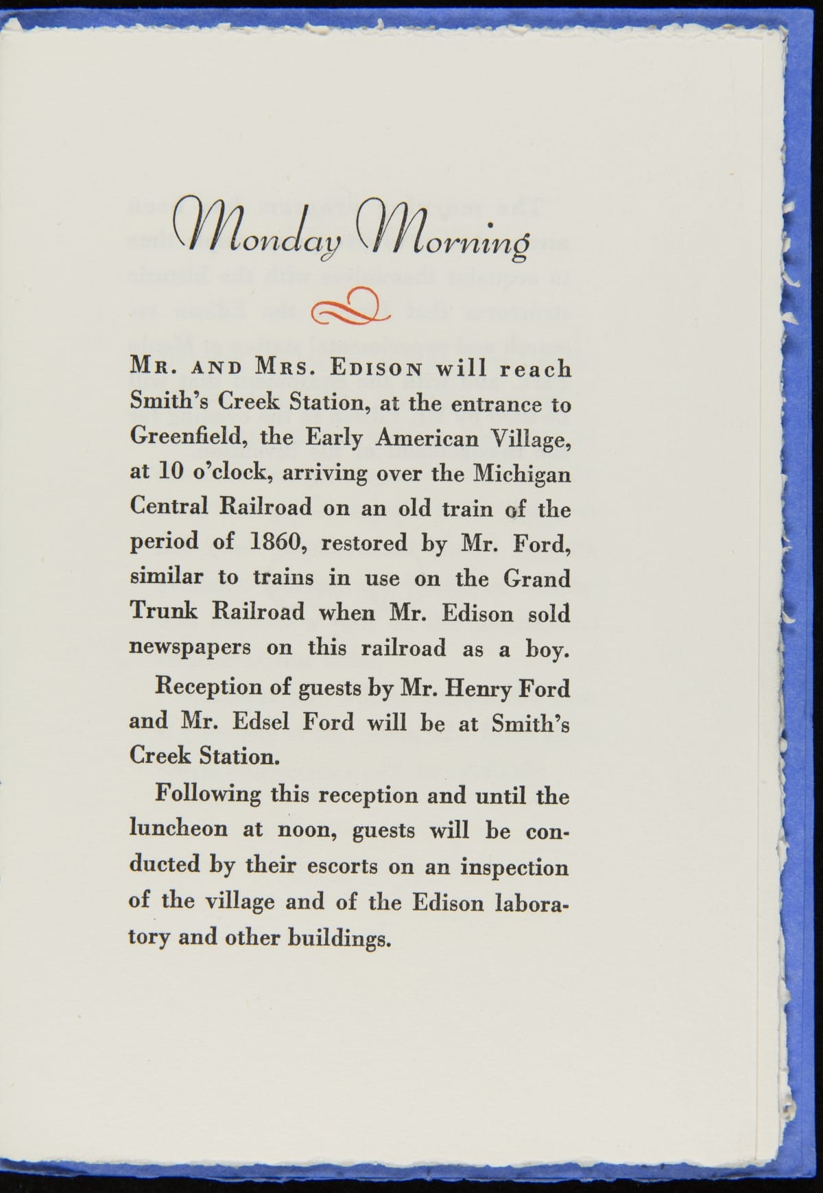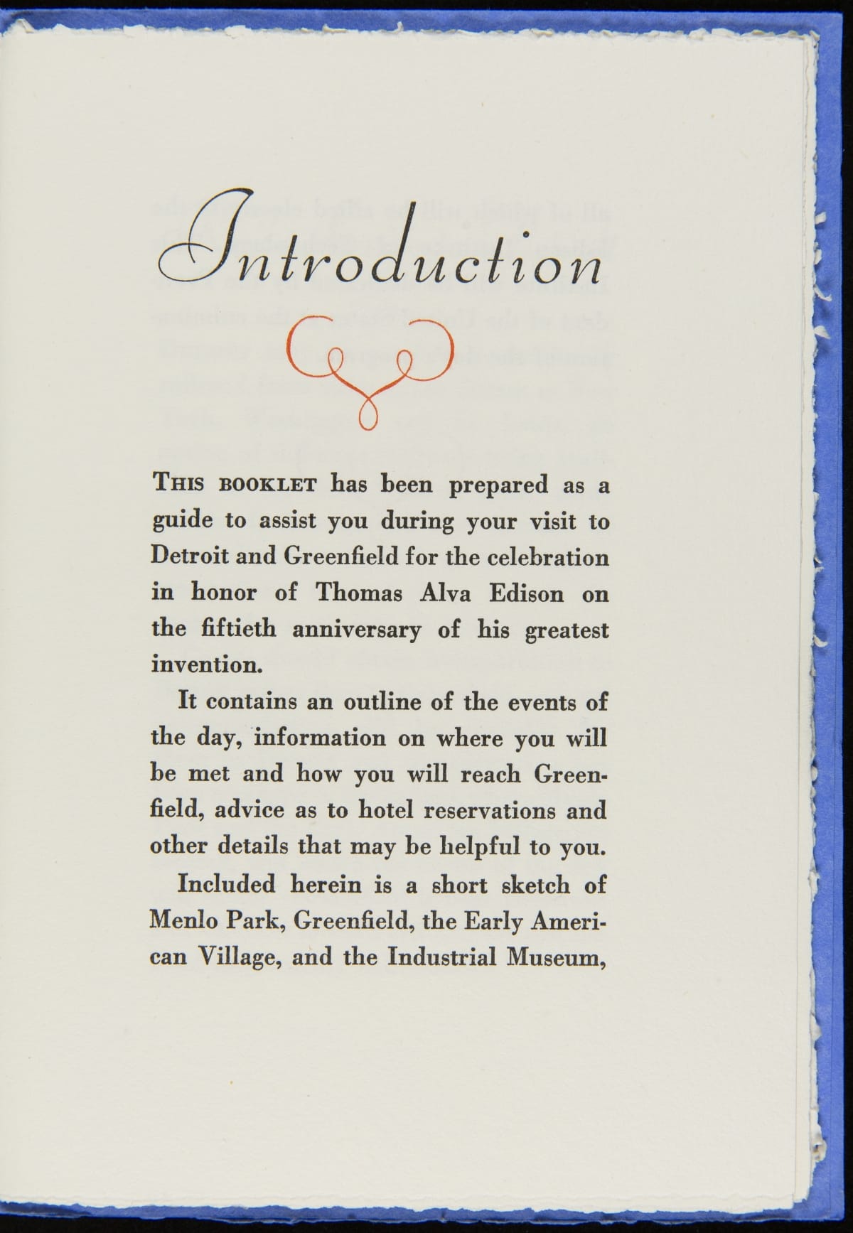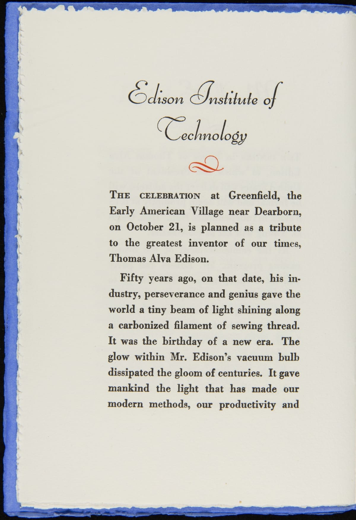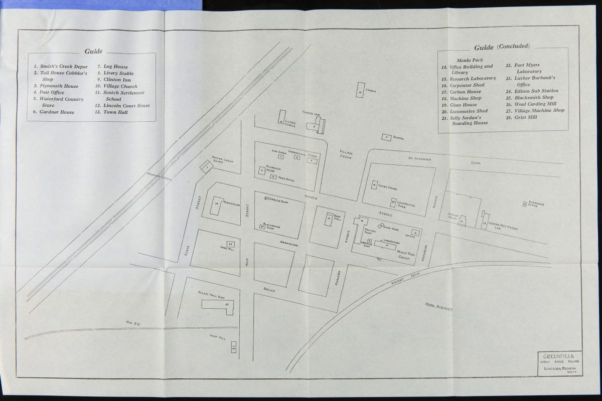 On October 21, 1929, Henry Ford hosted an event, Light's Golden Jubilee, which celebrated the 50th anniversary of Thomas Edison's invention of a practical incandescent lamp. The event also served as the official dedication of The Edison Institute, Ford's museum complex named in honor of his friend. This detailed guide provided guests with instructions on logistics and a description of the events to be enjoyed during the day-long celebration.
