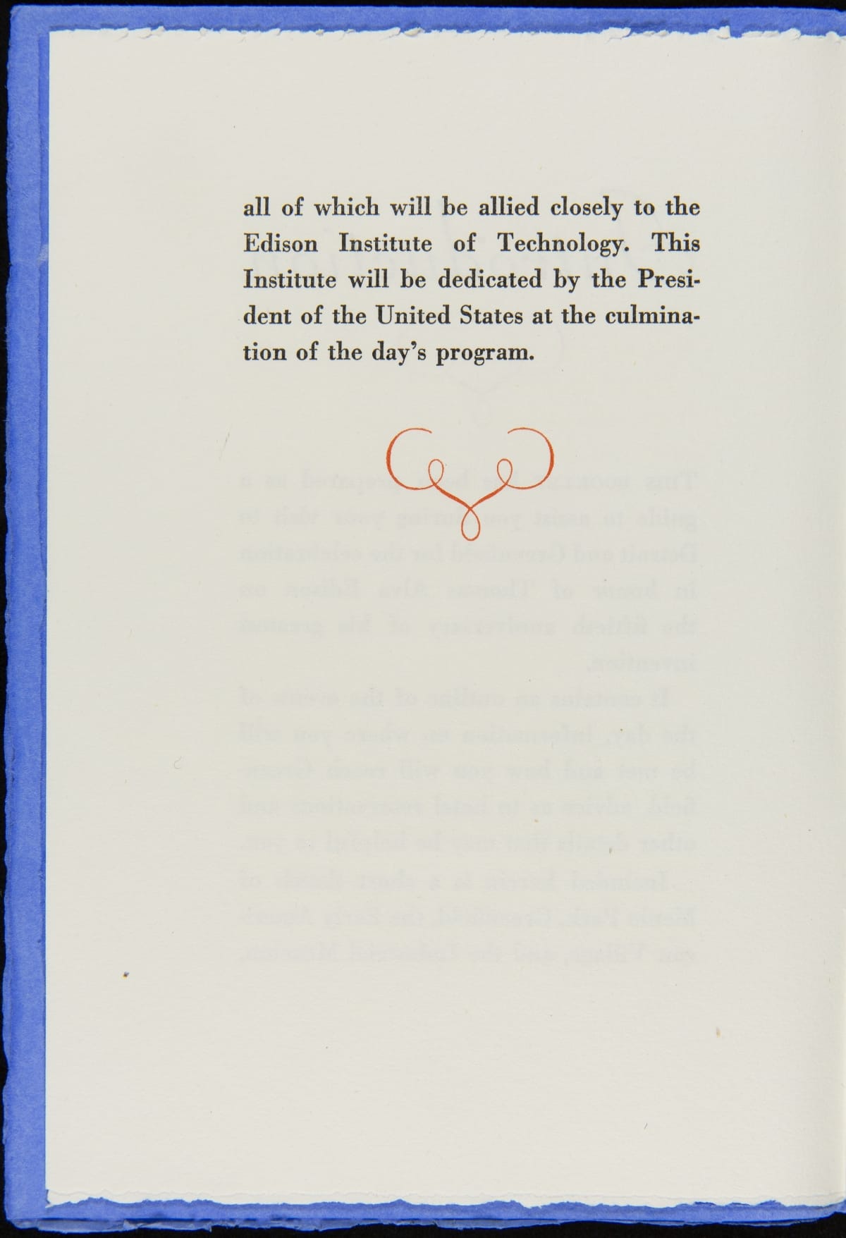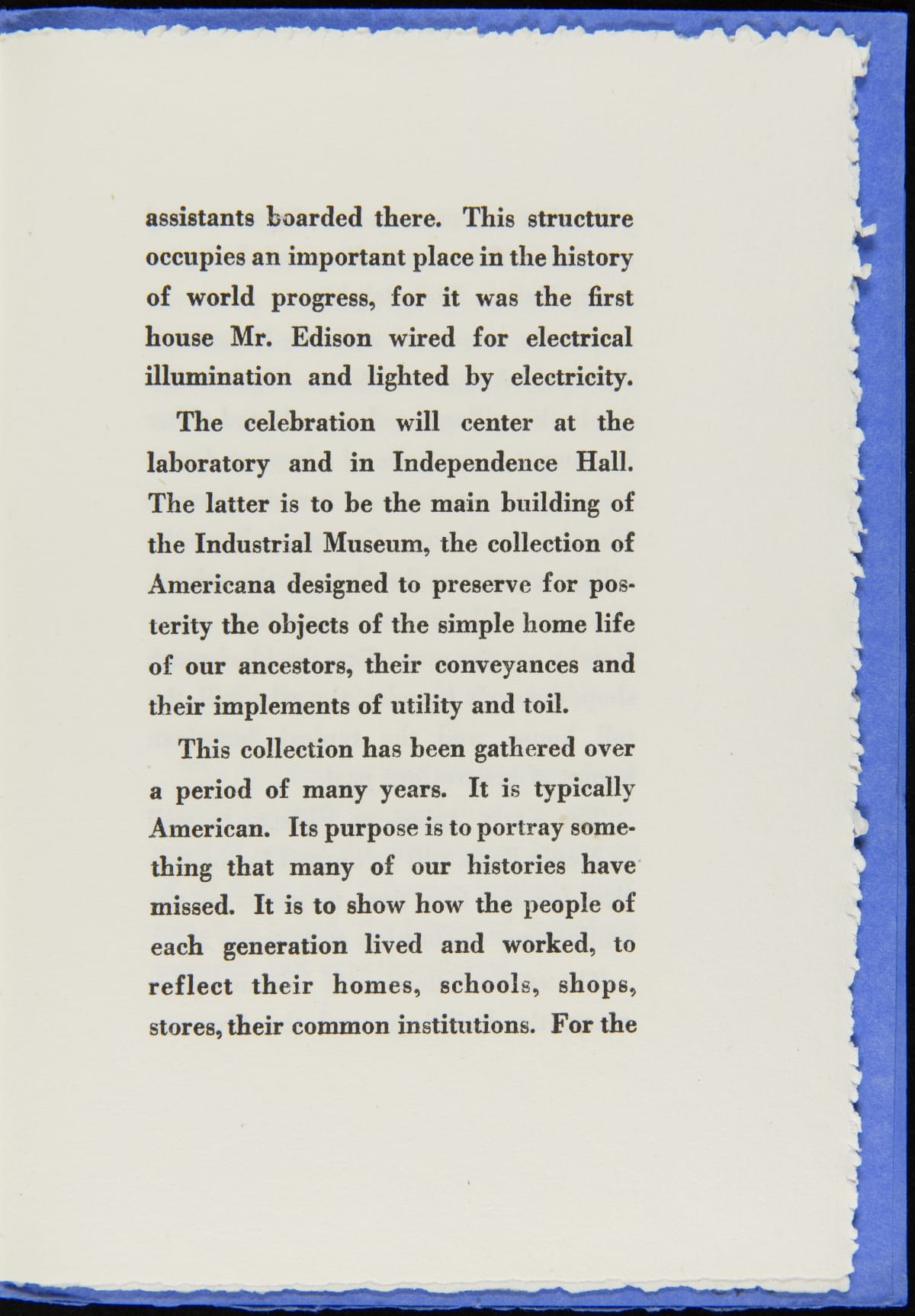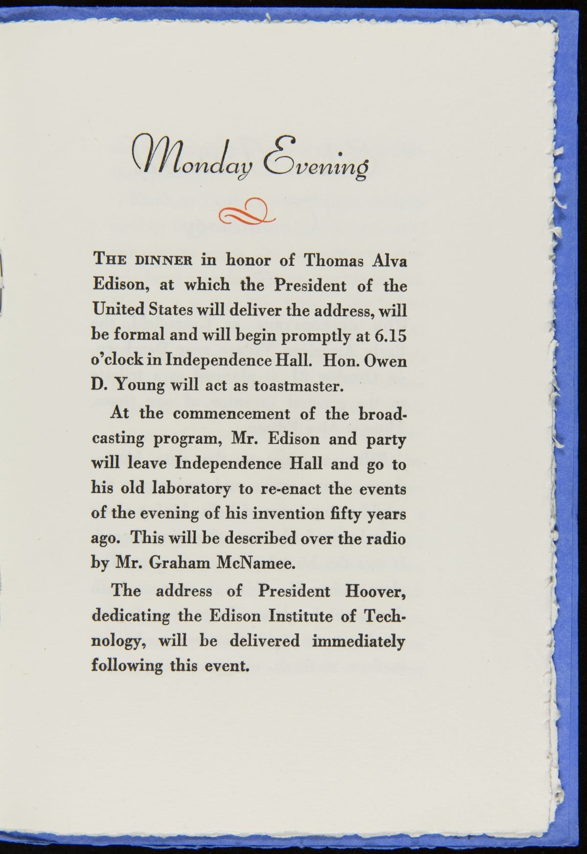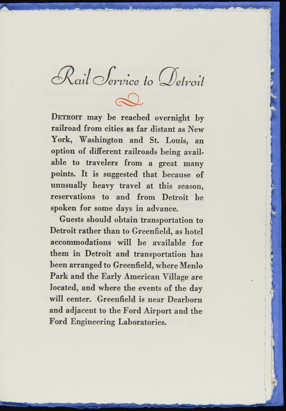 On October 21, 1929, Henry Ford hosted an event, Light's Golden Jubilee, which celebrated the 50th anniversary of Thomas Edison's invention of a practical incandescent lamp. The event also served as the official dedication of The Edison Institute, Ford's museum complex named in honor of his friend. This detailed guide provided guests with instructions on logistics and a description of the events to be enjoyed during the day-long celebration.