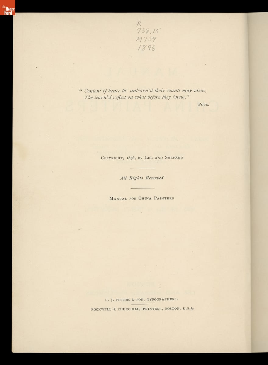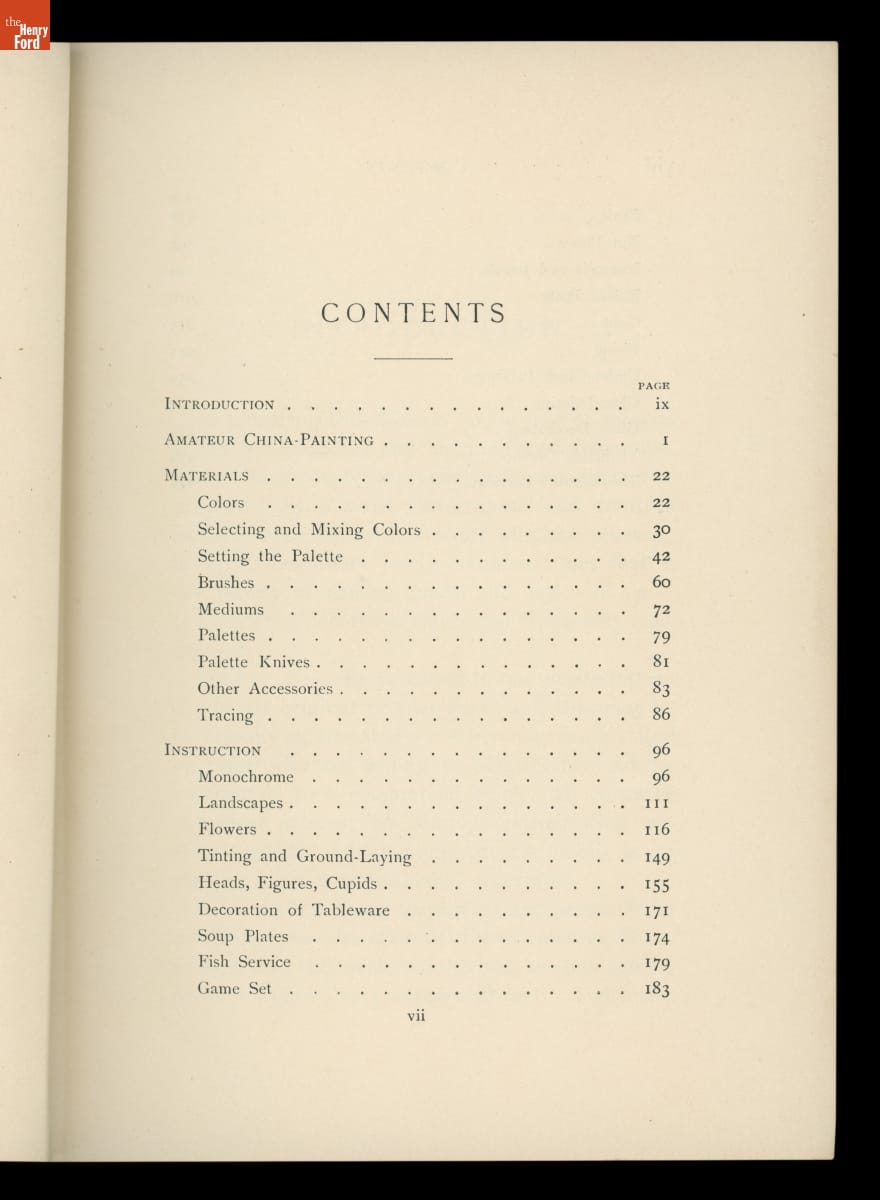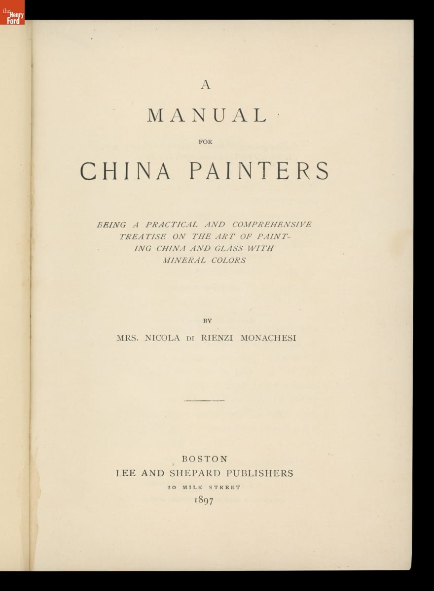 China painting was an important late-19th and early-20th-century pastime for many American women. They painted over the glaze of fired, undecorated pieces of white porcelain called "blanks." Amateur artists interested in china painting could purchase supplies--including blanks, paints, and instructional manuals such as this one--at specialty stores.
