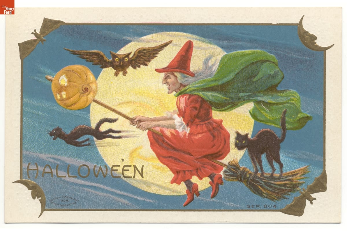 A distinctly American blend of Halloween traditions emerged by the late 1800s. Into the 20th century, the holiday was mostly an innocent celebration of mystery and fun, but friends and neighbors often exchanged seasonal greeting cards that evoked Halloween's superstitious origins. This colorful example alludes to olden customs and beliefs involving witchcraft, owls, and black cats.