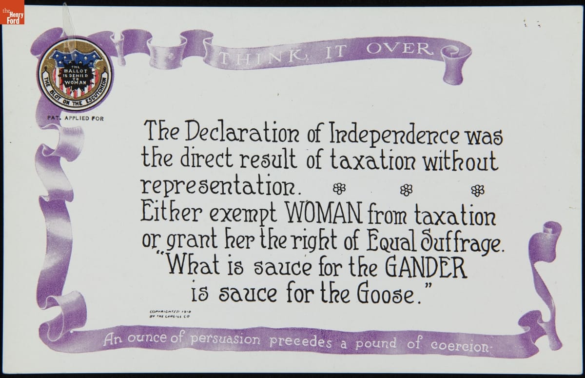 Printed on purple ribbon at top: Think It Over. Printed on purple ribbon at bottom: An Ounce of Persuasion Precedes a Pound of Coercion. Text in center: The Declaration of Independence was / the direct result of taxation without / representation. / Either exempt WOMAN from taxation / or grant her the right of Equal Suffrage. / What is sauce for the Gander / is sauce for the Goose.