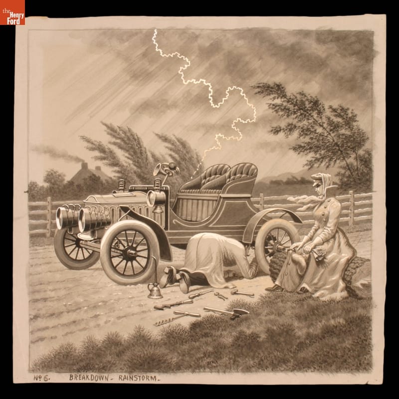 Before movies, Americans delighted in "Magic Lantern" slide shows. Artist Joseph Boggs Beale drew eight images for the 1906 slide series "Mr. Spurt and His Auto," lampooning the problems of early motoring. In this sixth slide, the Spurts' happy drive is interrupted when their car breaks down. Their misery is compounded by a heavy thunderstorm.