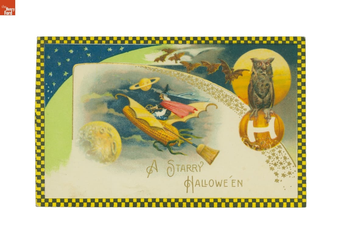 Halloween's superstitious origins gave way to a national celebration of mystery and innocent fun in 20th-century America. Seasonal greeting postcards commonly exchanged by friends and neighbors during Halloween reflected a distinctly American blend of olden customs and modern life. This colorful example from about 1915 features traditional superstitious symbols and a whimsical "airplane."