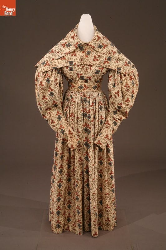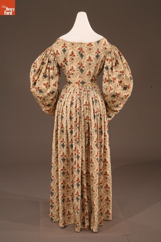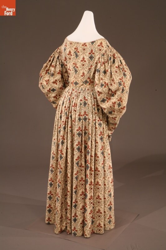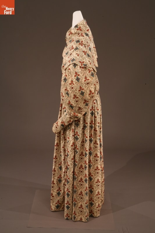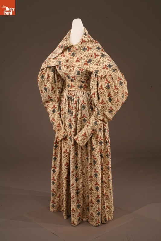 By the 1830s, factories in New England were able to produce a staggering 120 million yards of printed cotton textiles each year. People eagerly purchased these fabrics for dress goods, shirting, and home furnishings. This dress was later owned by children's author and illustrator Tasha Tudor, who lived a lifestyle reminiscent of the 1830s on her New Hampshire farm. Tudor used her collection of antique clothing as inspiration for her artwork.