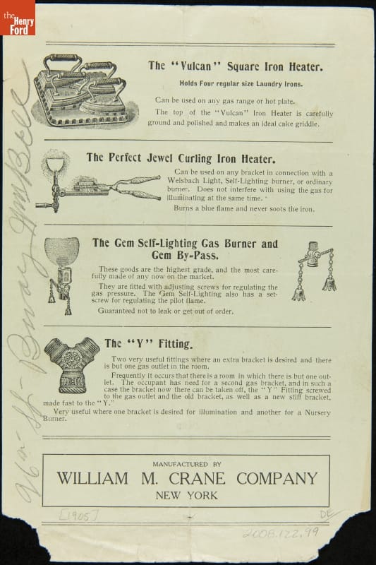 Printed at top of page: Vulcan / Handy Things / for every Home Printed in the middle of the page beside the illustrations is additional text that reads in part: The New Heat Light / The New "Vulcan" Toaster / The Fairgrieve Toaster / The "Vulcan" Featherweight Nursery Burner Printed beside toaster: The "Vulcan" represents the very latest type of toasters / designed for use on the gas range or hot plate. / It is the only toaster now on the market which will / evenly toast four slices of bread at the same time without / the need of changing or shifting the position of the bread / during the process of toasting. Printed at bottom of page on the back side: Manufactured by / William M. Crane Company / New York Handwritten in pencil on back of page: 96th St.- Bway Wm Bell Printed in very small numbers on lower front: 38-10M- 8-23-05
