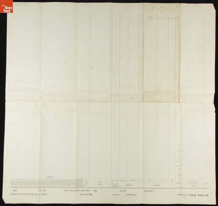on back: Muster and Descriptive Roll of men Drafted and Mustered into the Service of the United States Forwarded to Regt from Draft Rendezvous / at Elmira N.Y. commanded by Col. B.F. Tracy pursuant [?] to instructions A.G.O. Feby. 9th 1865 and assigned to Co. "G" 25th Inf [?] C.I. April 12th 1865 / by order Col F L Hitchcock Cmdr Regt / Drafted and enlisted into the / service of the United States / I certify in honor that this Muster and Descriptive / Roll is a correct abstract from the original Roll / on File at these Hdqrs. / Ft. Barrancas Fla. / April 12th 1865 / [Signed in different hand:] F.L. Hitchcock