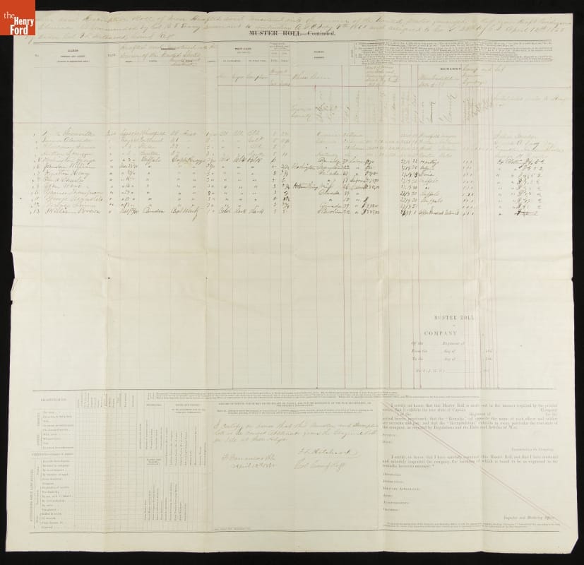 Many African Americans proudly joined the Union Army during the Civil War. Though at first turned away, after May 1863 the U. S. War Department began to actively recruit African-American troops. By war's end over 180,000 men in 175 regiments had joined the United States Colored Troops. This muster roll reveals the names of 13 men serving in Company G, 25th Regiment in 1865.