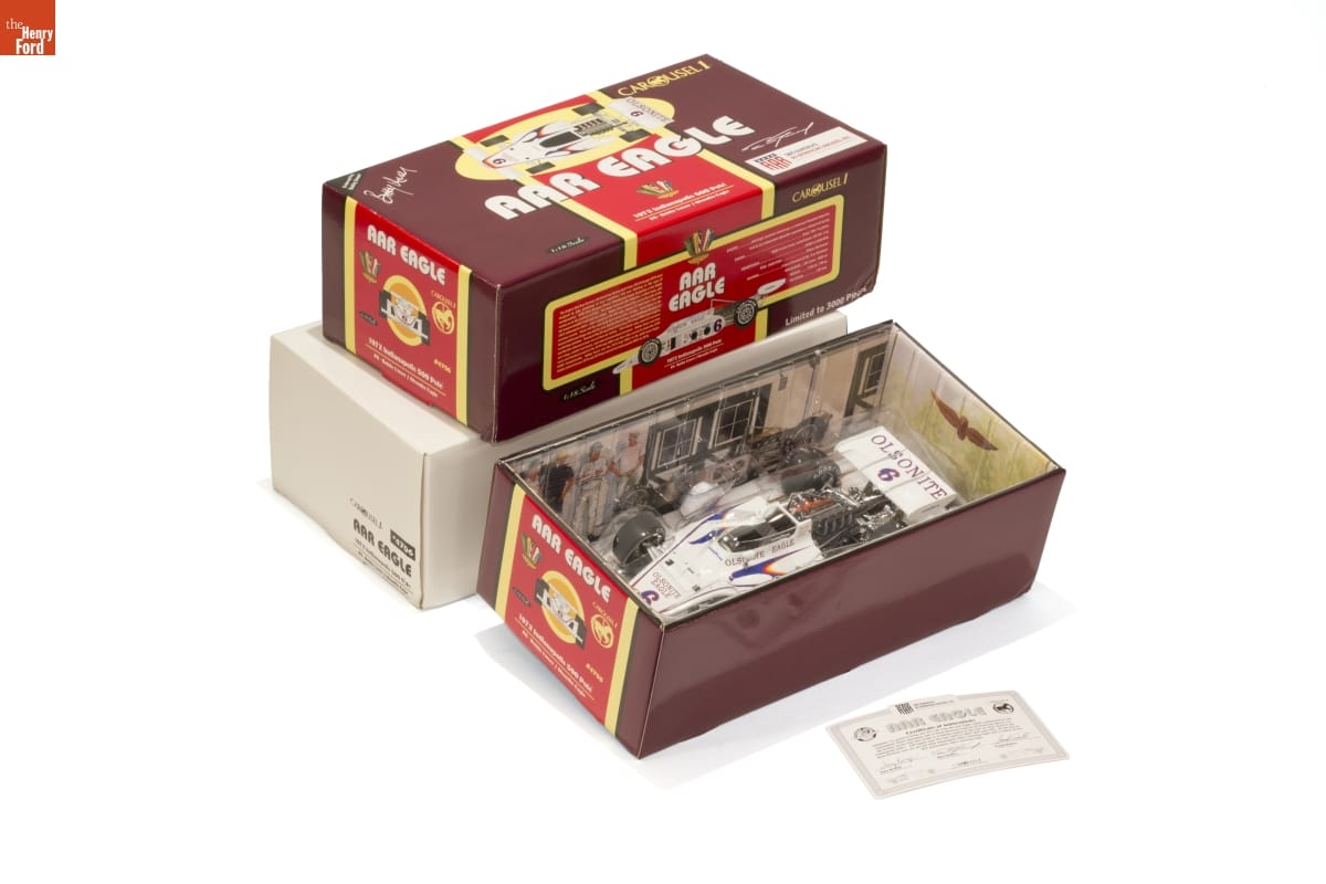 On label on outer box: CAROUSEL 1/ #4706/ AAR EAGLE/ 1972 Indianapolis 500 Pole®/ #6 - Bobby Unser/ Olsonite Eagle On top of inner box: AAR EAGLE/ Endorsed by/ Bobby Unser/ CAROUSEL 1/ 1972 Indianapolis 500 Pole®/ #6 - Bobby Unser/ Olsonite Eagle/ DAN GURNEY'S/ ALL AMERICAN RACERS, INC. On side of inner box: AAR EAGLE/.../ Limited to 3000 Pieces On ends of inner boxes: AAR EAGLE/ CAROUSEL 1/ 1:18 Scale/ #4706/ 1972 Indianapolis 500 Pole/ #6 - Bobby Unser/ Olsonite Eagle On model: OLSONITE/ EAGLE/ 6 On tires and on model below cockpit: GOODYEAR