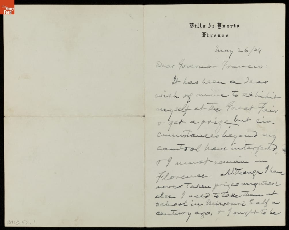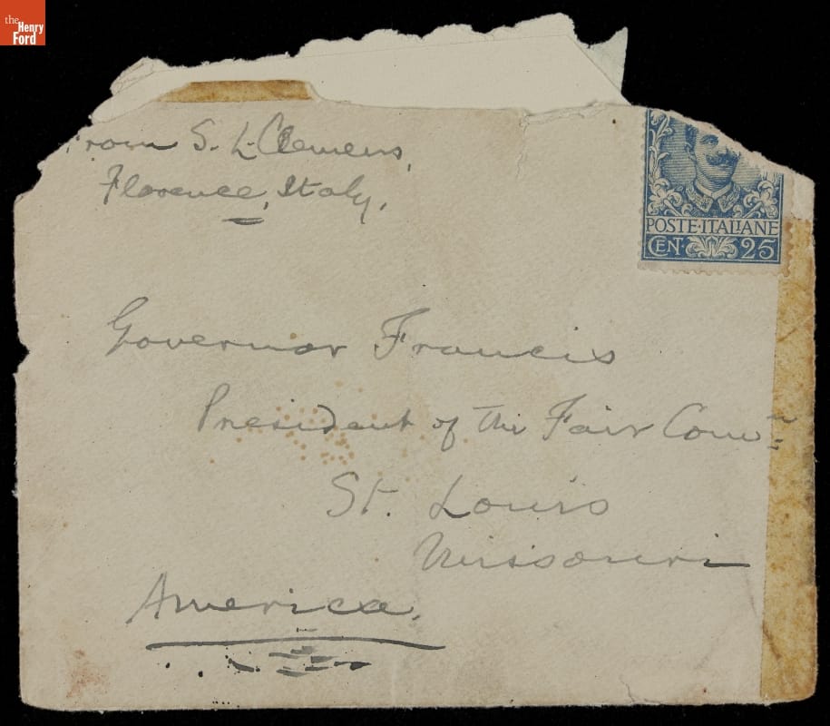 The 1904 St. Louis World's Fair, commemorating the 1803 Louisiana Purchase, featured agricultural, scientific, and industrial exhibits from the United States and around the world. This tongue-in-cheek letter documents folksy writer Mark Twain's submission of a portrait to the fair for a competition. Twain grew up in Hannibal, Missouri, and had fond ties to the area.