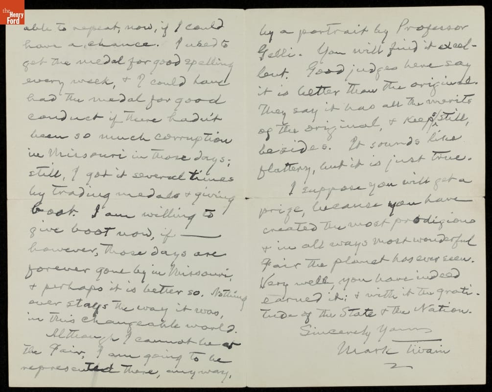 Although I cannot be at the Fair, I am going to be represented there, anyway, by a portrait by Professor Gelli. You will find it excellent. Good judges here say it is better than the original. They say it has all the merits of the original, & keeps still besides. It sounds like flattery, but it is just true. I suppose you will get a prize, because you have created the most prodigious & in all ways most wonderful Fair the planet has ever seen. Very well, you have indeed earned it, & with it the gratitude of the State of The Nation.