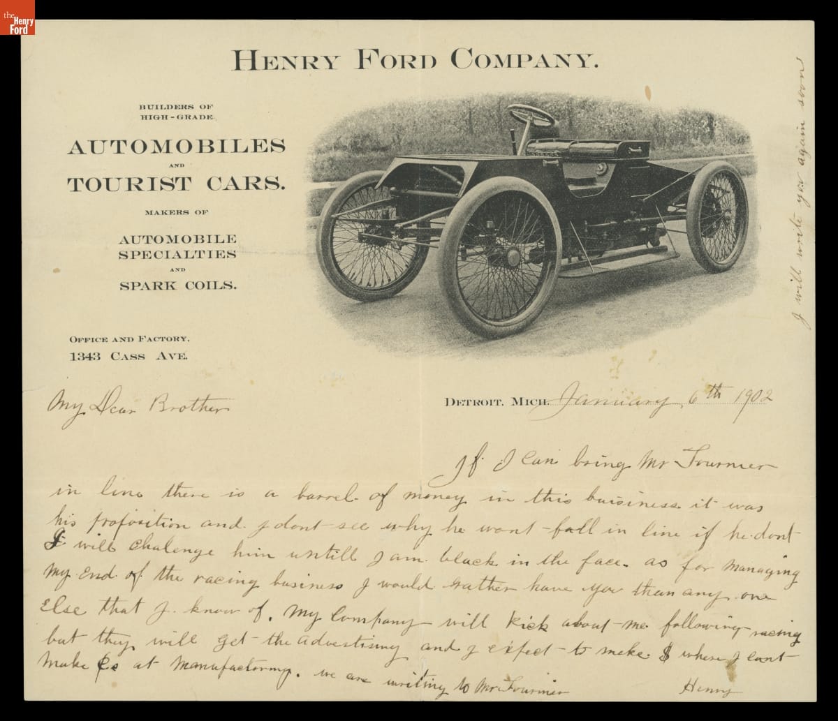 Printed at top: HENRY FORD COMPANY. / BUILDERS OF / HIGH GRADE / AUTOMOBILES / AND / TOURIST CARS, / MAKERS OF / AUTOMOBILE / SPECIALTIES / AND / SPARK COILS, / OFFICE AND FACTORY / 1343 CASS AVE. / DETROIT, MICH. Handwritten text: My Dear Brother If I can bring Mr Fournier in line there is a barrel of money in this business. it was his proposition and I dont see why he wont fall in line if he dont I will chalenge (sic) him untill I am black in the face. as for managing my end of the racing business I would rather have you than any one else I know of. My Company will kick about me following racing but they will get the advertising and I expect to make $ where I cant make (cents) at manufacturing. we are writing to Mr. Fournier Henry